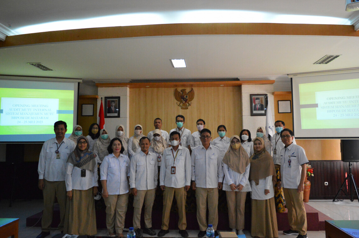 Audit Internal di Balai Besar POM di Mataram dengan tujuan Audit kesesuaian penerapan Sistem Manajemen Mutu ISO 9001:2015 yang terintegrasi dengan pemantauan Sistem Pengendalian Intern Pemerintah (SPIP) dalam kerangka manajemen risiko, Reformasi Birokrasi dalam kerangka pembangunan Zona Integritas menuju WBK/WBBM dan Sistem Manajemen Laboratorium SNI ISO/IEC 17025:2017, ISO 17034:2016, dan ISO 45001:2018.