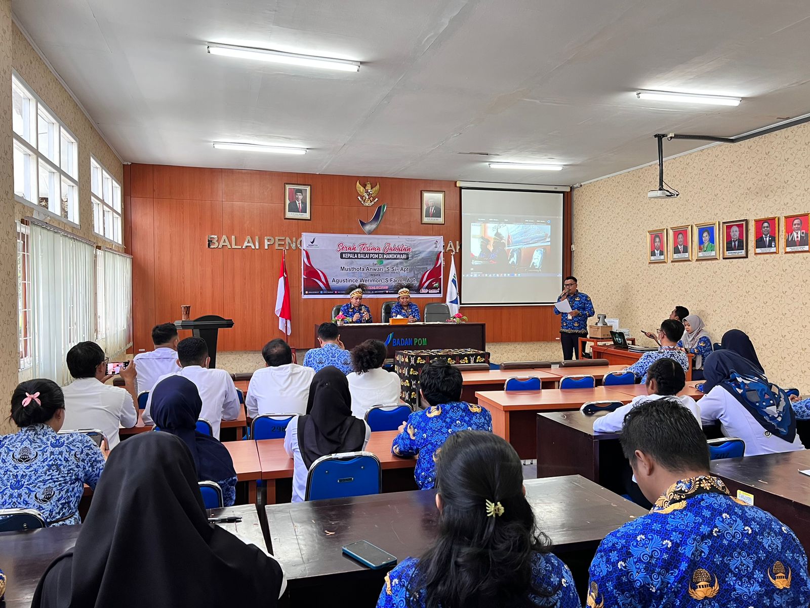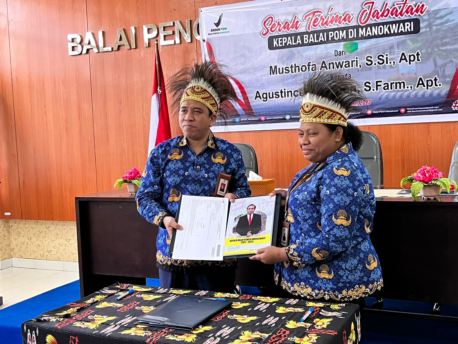Senin, 22 Mei 2023, dilaksanakan acara serah terima jabatan Kepala Balai POM di Manokwari dari Bpk Musthofa Anwari, S.Si., Apt kepada pejabat baru Ibu Agustince Werimon, S.Farm., Apt di Aula Balai POM Manokwari.