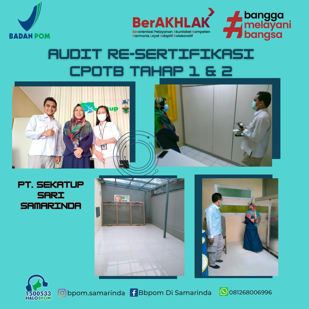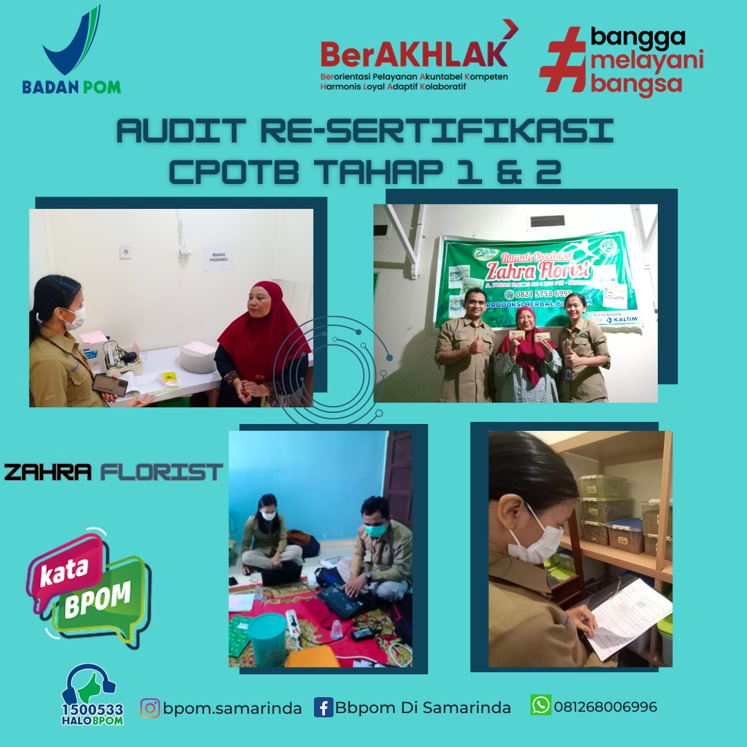 Senin-Kamis, 22-25 Mei 2023, Tim Sertifikasi BBPOM di Samarinda melakukan Audit Re-sertifikasi Perpanjangan Cara Pembuatan Obat Tradisional yang Baik Tahap I dan II pada dua pelaku usaha obat tradisional yaitu Zahra Florist dan PT. Sekatup Sari Indonesia di Kota Bontang. Pada audit ini dilakukan pemeriksaan dokumen pada aspek Higiene Sanitasi dan Aspek Dokumentasi. Audit ini untuk melihat konsistensi pelaksanaan CPOTB yang dilaksanakan di tempat produksi pelaku usaha.