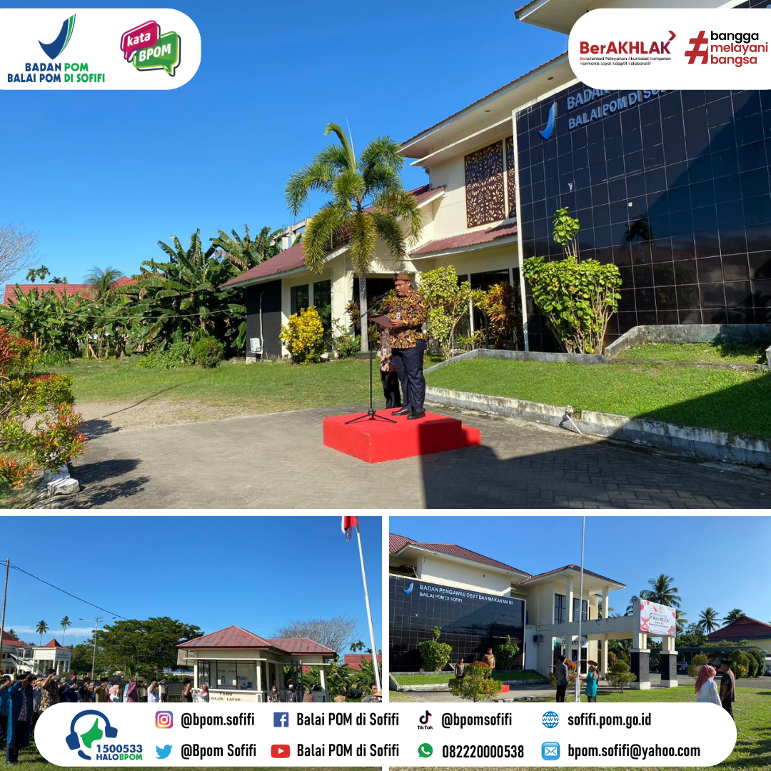 Sofifi – Kamis (01/06/2023) Balai POM di Sofifi melaksanakan Upacara Pengibaran Bendera Merah Putih dalam rangka memperingati Hari Lahir Pancasila. Tiap 1 Juni rutin dilaksanakan upacara tersebut untuk meningkatkan kesadaran tiap warga negara Indonesia untuk senantiasa mengamalkan nilai-nilai Pancasila dalam kehidupan sehari-hari. Pada tahun ini, diusung tema “Gotong Royong untuk Membangun Peradaban dan Pertumbuhan Global”.