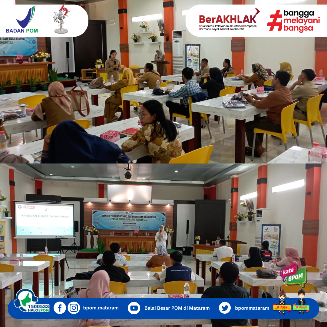 Dalam Sambutannya Kepala Dra. I Gusti Ayu Adhi Aryapatni, Apt menyampaikan bahwa kedepan petugas pengelola pasar yang yang telah dilatih ini agar dapat melakukan pengawasan terhadap bahan berbahaya, bahan pangan yang diduga mengandung bahan berbahaya di pasar yang dikelolanya. Pasar yang akan dijadikan intervensi oleh petugas adalah pasar Gerung di Kabupaten Lombok Barat. Untuk memberikan apresiasi atas pelaksanaan program prioritas nasional (Program Desa Pangan Aman, Program Sekolah dengan PJAS Aman, dan Program Pasar Pangan Aman Berbasis Komunitas), Badan POM akan menyelenggarakan Lomba Desa Pangan Aman, Lomba Sekolah dengan PJAS Aman dan Lomba Pasar Pangan Aman Berbasis Komunitas pada akhir tahun 2023. Turut hadir pada kegiatan tersebut Kepala Dinas Kesehatan Lombok Barat Arief Suryawirawan, S,si., Apt., MPH Dan Kepala Dinas Perindustrian dan Perdagangan Lombok Barat Ir.H.Muhur Zokhri.