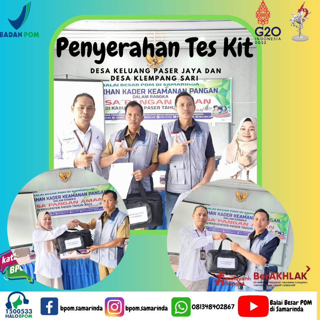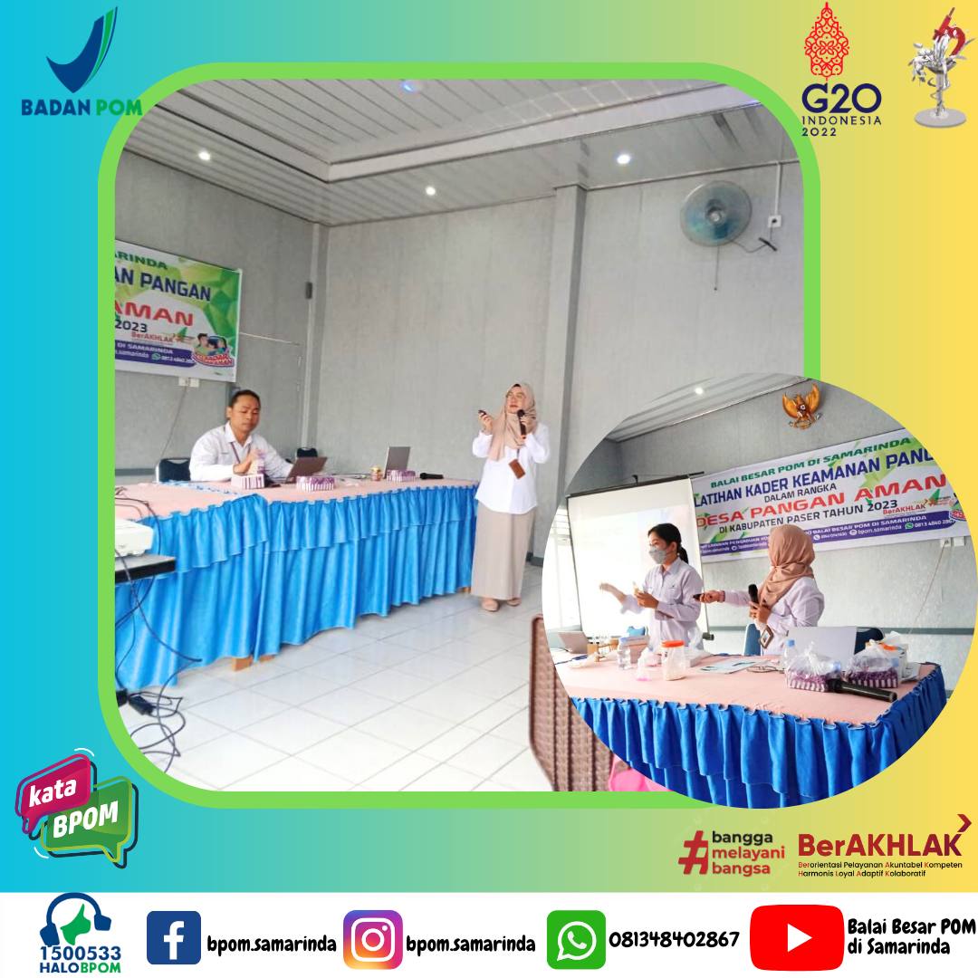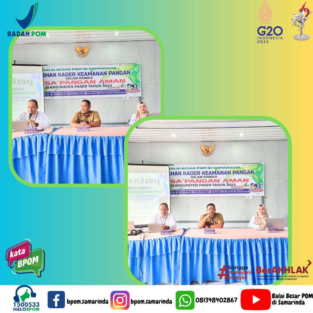 Sebagai rangkaian dari program Desa Pangan Aman Tahun 2023 di Kabupaten Paser, Balai Besar POM di Samarinda melaksanakan kegiatan Pelatihan kepada Kader Keamanan Pangan dari dua Desa di Kecamatan Kuaro Kabupaten Paser, yaitu Desa Klempang Sari dan Desa Keluang Pasir Jaya, Rabu 29 Juni 2023 bertempat di Ruang Pertemuan Umum Kantor Kecamatan Kuaro.