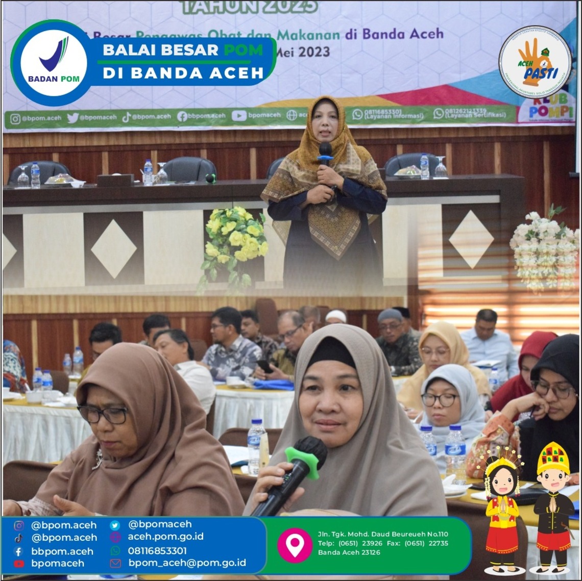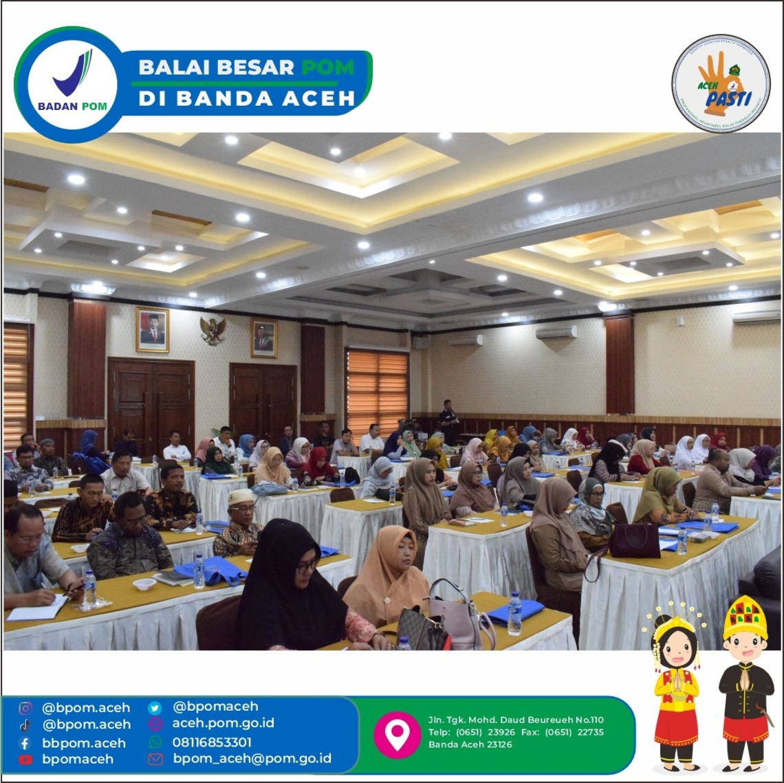 Sehubungan hal tersebut, maka Balai Besar POM di Banda Aceh (BPOM Aceh) melaksanakan Bimbingan Teknis Keamanan Pangan untuk Kader Keamanan Pangan Sekolah bertempat di Convention Hall Hotel Diana, dengan dibuka langsung oleh Kepala BPOM Aceh, Yudi Noviandi, M.SC., Tech., Apt. dan dihadiri oleh peserta yang terdiri dari lintas sector terkait, diantaranya, Dinas Pendidikan, Kementerian Agama, Dinas Kesehatan, dan Perwakilan Puskesmas dari Kabupaten/Kota Aceh Besar, Bireuen, Bener Meriah dan Langsa
