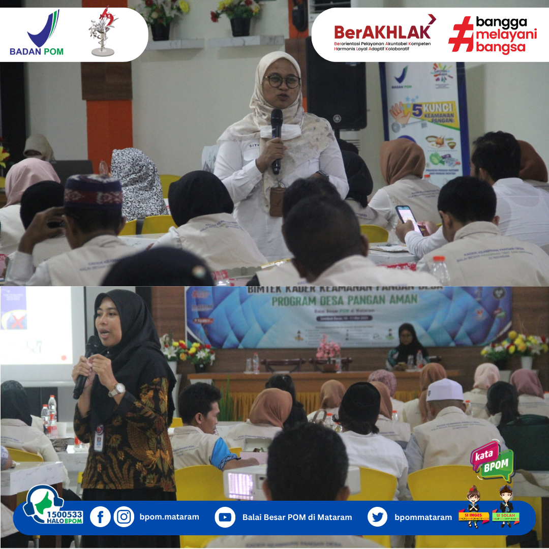 Batulayar, Rabu-Kamis tanggal 10 – 11 Mei 2023 BBPOM di Mataram melaksanakan Bimtek Kader Keamanan Pangan Desa (KKPD) di Kabupaten Lombok Barat, yang bertempat di GEM Pearl dan Resto, Kabupaten Lombok Barat. Kegiatan bimtek tersebut diikuti oleh 78 peserta yang terdiri dari 26 orang dari masing-masing desa yang diintervensi, yaitu Desa Penimbung, Desa Cendi Manik, Desa Batu Kumbung. 26 orang kader yang dilatih terdiri dari: