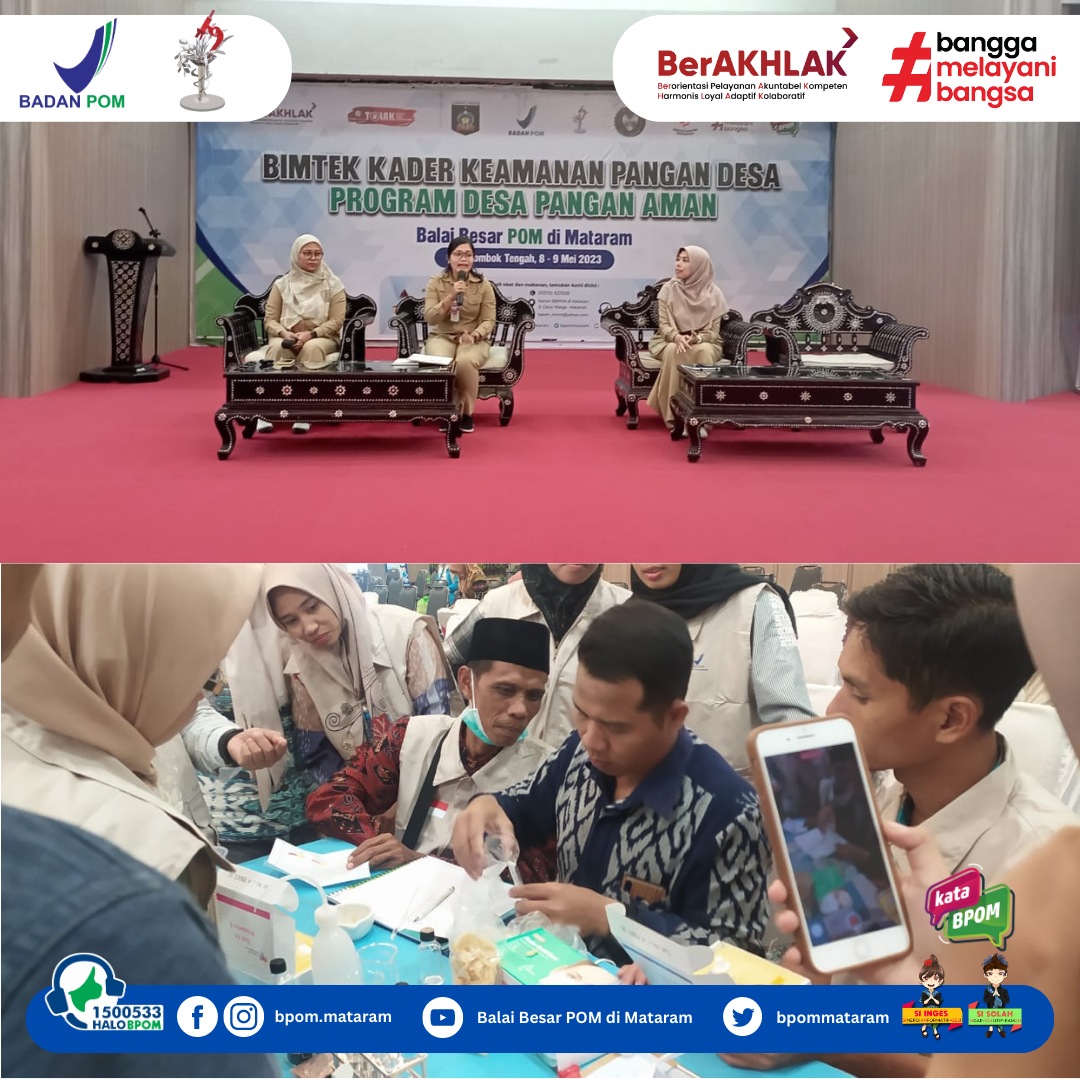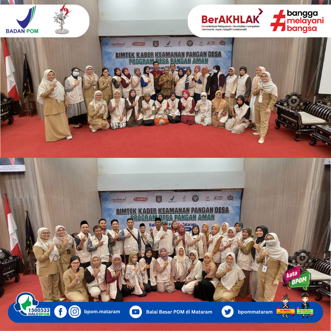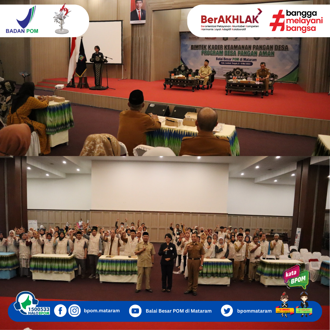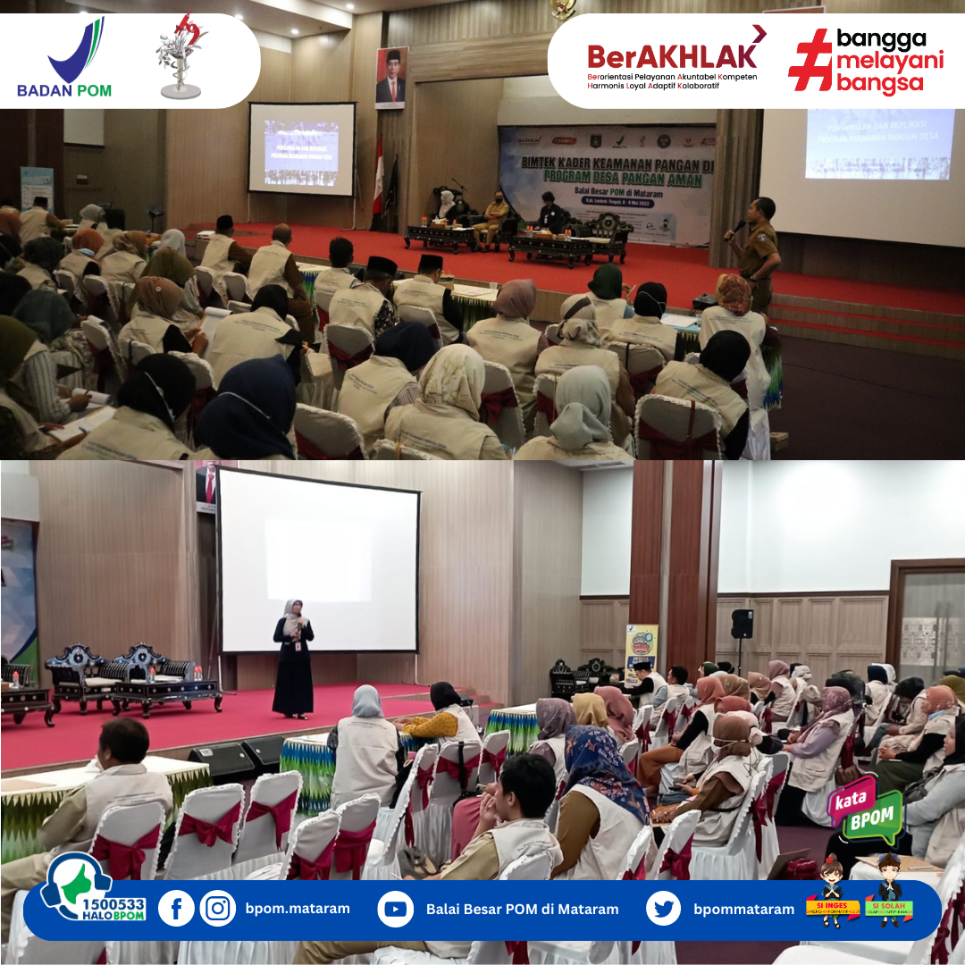 Praya, Senin-Selasa tanggal 8-9 Mei 2023 BBPOM di Mataram melaksanakan Bimtek Kader Keamanan Pangan Desa (KKPD) di Kabupaten Lombok Tengah, yang bertempat di Ballroom Kantor Bupati Lombok Tengah. Kegiatan bimtek tersebut diikuti oleh 104 peserta yang terdiri dari 26 orang dari masing-masing desa yang diintervensi, yaitu Desa Setiling, Desa Sintung, Desa Teruwai dan Desa Lendang Are. 26 orang kader yang dilatih terdiri dari: