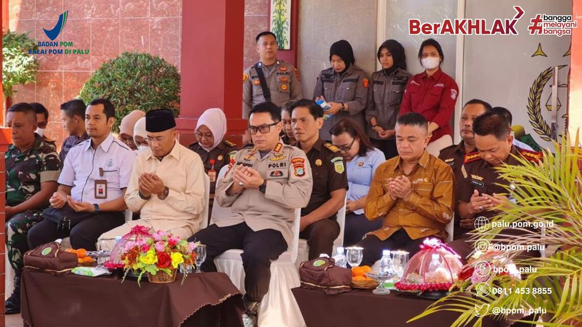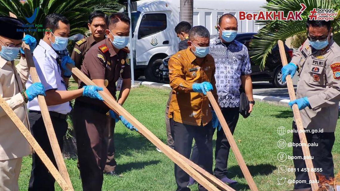 Palu - Kamis (11/05/2023) Kepala Balai POM di Palu, Agus Riyanto menghadiri kegiatan pemusnahan barang bukti yang diselenggarakan di halaman Kantor Kejaksaan Negeri Palu. Acara tersebut dihadiri Walikota Palu, Kapolres Palu, Ketua Pengadilan Negeri Palu, BNN Kota Palu, Kodim dan Wakil Ketua DPRD Palu.