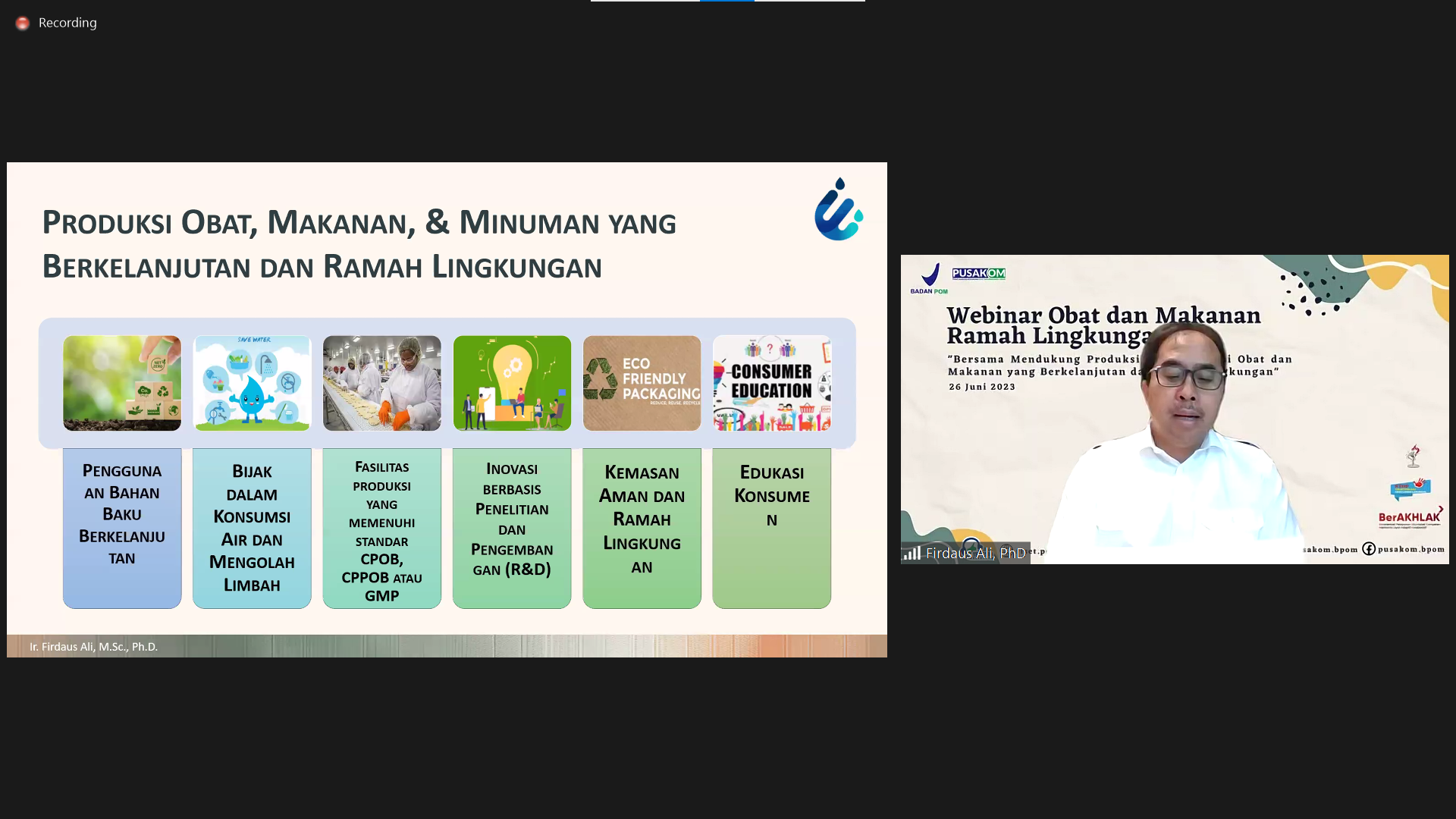 Jakarta – Mengangkat tema “Bersama Mendukung Produksi dan Konsumsi Obat dan Makanan yang Berkelanjutan dan Ramah Lingkungan”, Pusat Analisis Kebijakan Obat dan Makanan (Pusakom) BPOM menyelenggarakan Webinar Obat dan Makanan Ramah Lingkungan Tahun 2023, Senin (26/06/2023). Webinar ini dilaksanakan dalam rangka memperingati Hari Lingkungan Hidup Sedunia dan Hari Keamanan Pangan Sedunia. Webinar ini membahas regulasi dan kebijakan terkait lingkungan yang relevan dengan obat dan makanan, mengingat isu lingkungan hidup saat ini merupakan isu yang menjadi sorotan utama di tingkat global.