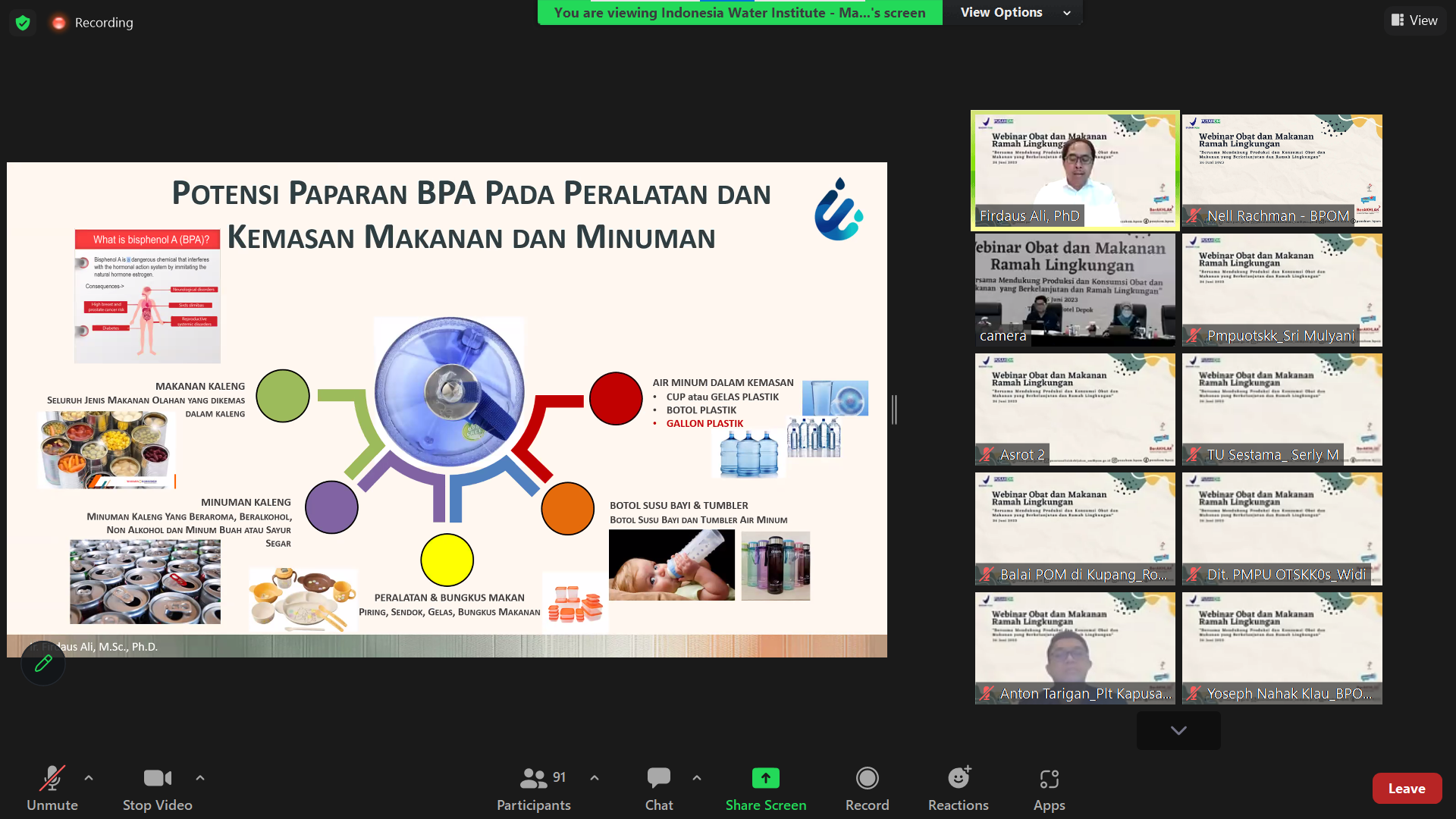 Webinar ini diikuti oleh kurang lebih 100 peserta yang hadir secara luring di Hotel Margo Depok dan secara daring melalui zoom meeting. Peserta berasal dari perwakilan unit kerja pusat dan unit pelaksana teknis BPOM, perwakilan Kementerian Lingkungan Hidup dan Kehutanan (KLHK), Badan Riset dan Inovasi Nasional (BRIN), dan Gabungan Perusahaan Farmasi Indonesia.