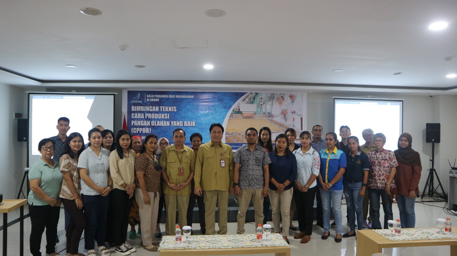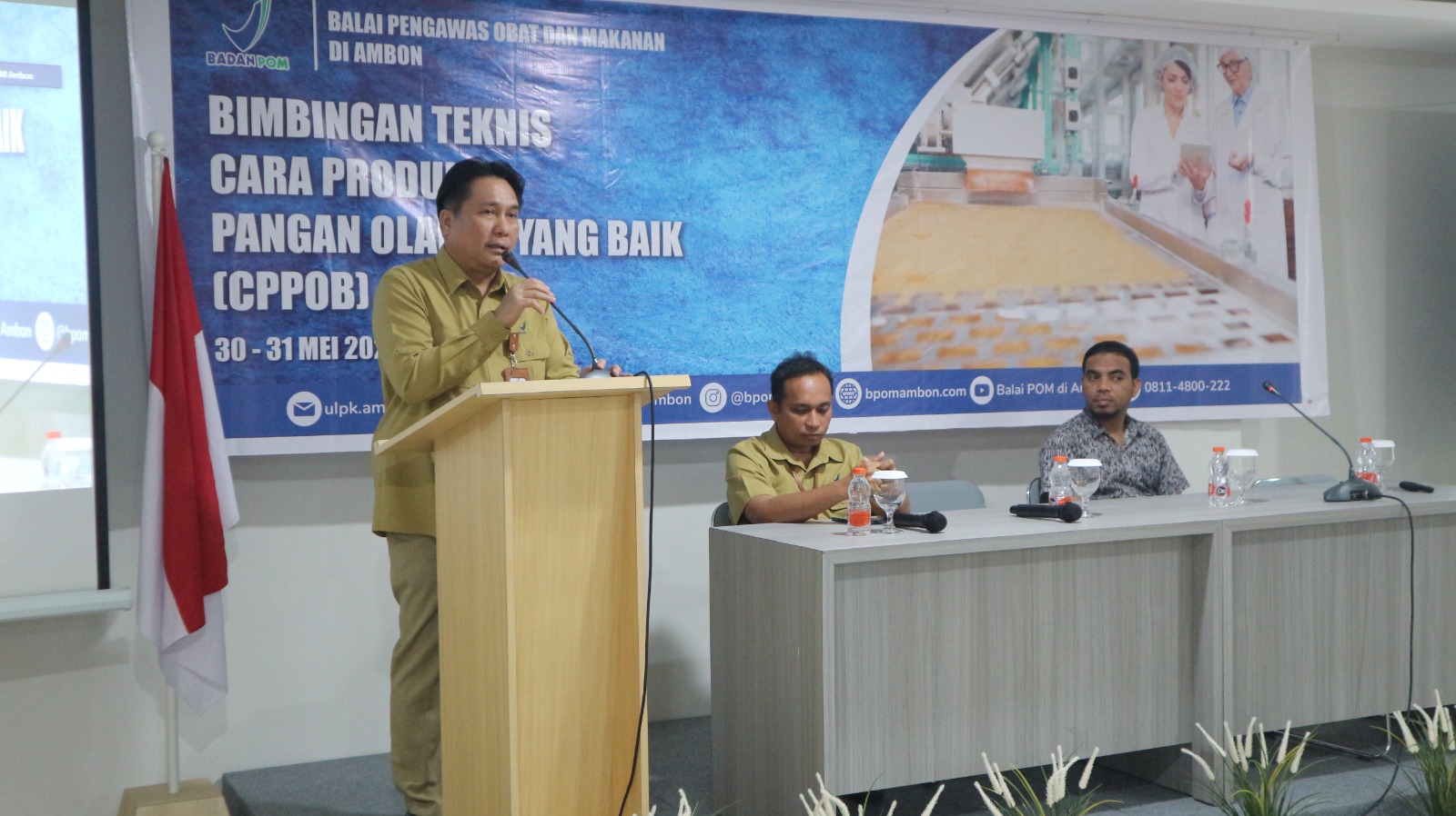 Ambon (01/06) - Pada hari selasa dan rabu, tgl 30 – 31 Mei 2023, bertempat di Kamari Hotel, Jl. Kakialy No 25 & 27, Kadewatan, Sirimau, Ambon, Maluku, Balai POM di Ambon menyelenggarakan Bimbingan Teknis Cara produksi Pangan Olahan Yang Baik (CPPOB) dalam rangka implementasi salah satu inovasi Praktek Baik yang dilaksanakan oleh Balai POM Ambon yaitu Inovasi “Pentas Sagu” atau Pendampingan Penerbitan Izin Edar Pangan Sekaligus Sertifikasi CPPOB. Pentas Sagu merupakan praktek baik yang telah dijalankan oleh Balai POM di Ambon selama beberapa tahun terkahir yakni proses pendampingan pelaku usaha pangan olahan pada proses sertifikasi IP CPPOB dan izin edar MD. Pelaksanaan Bimtek CPPOB ini juga merupakan salah satu tahapan pendampingan UMKM pangan olahan pada tahun 2023 untuk memperoleh Izin Penerapan CPPOB.