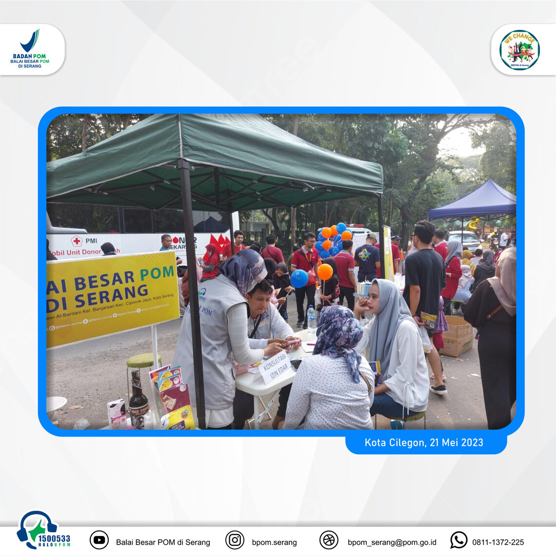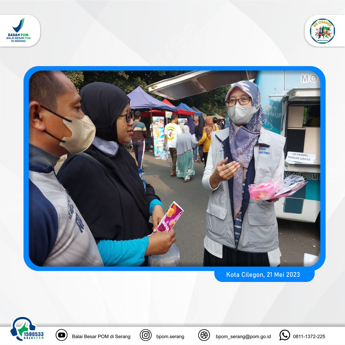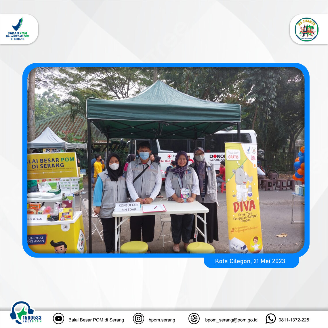 >Inovasi Pelayanan Publlik Drive Thru Pengujuan Sampel Pangan Olahan (Diva) hadir kembali di Kota Cilegon bertempat di CFD Kota Cilegon pada Minggu 21/05/23. DIVA di Cilegon tidak hanya memberikan pelayanan pengujian sampel pangan sevara GRATIS, namun juga memberika pelayanan konsultasi dan fasilitasi pendaftaran izin edar.