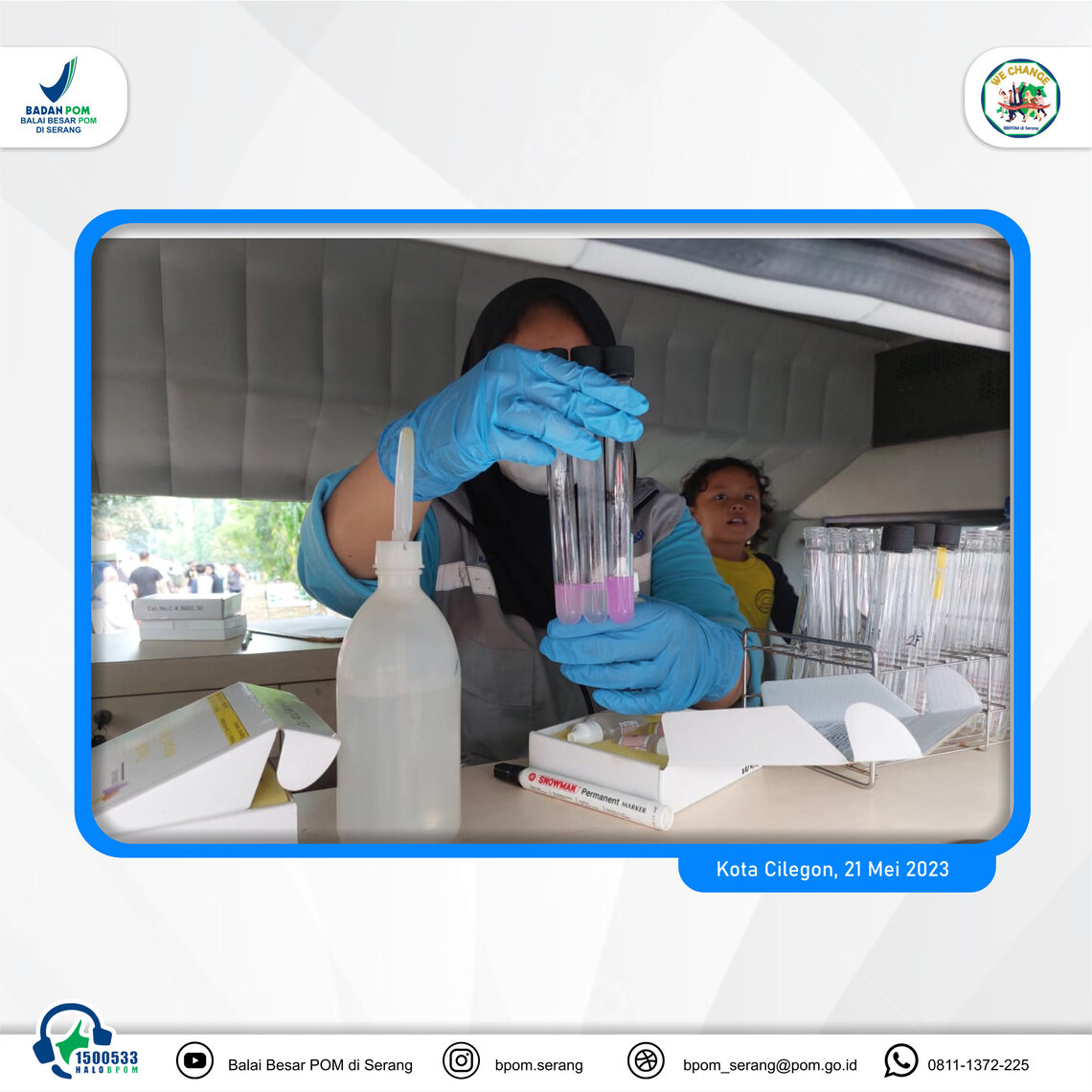 Area CFD Kota Cilegon dipilih menjadi lokasi DIVA di bulan mei dikarenakan di lokasi ini banyak sekali jajanan untuk di cek keamanannya dan terdapat Paguyuban Wirausaha Cilegon (Pawon) yang berjualan di area CFD untuk difasilitasi pendaftaran izin edar. Sebanyak 8 sampel makanan yang dibawa oleh masyarakat telah diuji dengan hasil 3 sampel positif rhodamin B dan 5 sampel negatif bahan berbahaya. terhadap hasil uji yang positif, petugas BBPOM di Serang telah melakukan pembinaan dan menginfokan ke ketua Penyelenggara CFD Kota Cilegon untuk melarang produk tersebut dijua kembali di CFD. Pada kegiatan ini satu pelaku usaha telah berhasil difasilitasi pendaftaran izin edar hingga terbit izin edar PIRT untuk minuman serbuk coklat dan brownies coklat.