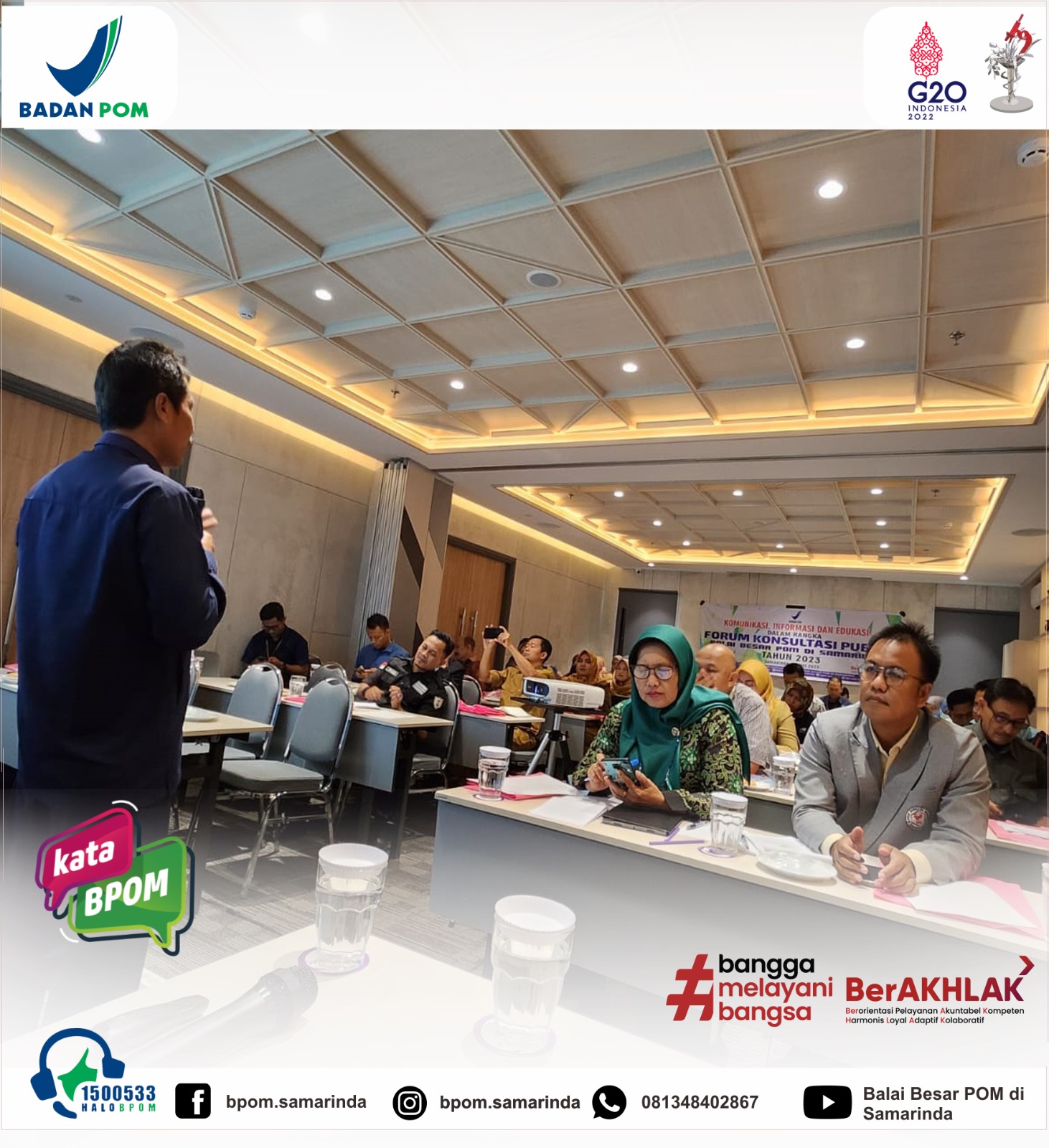 Senin 08 Mei 2023 Balai Besar Pengawas Obat dan Makanan (BBPOM) di Samarinda melaksanakan kegiatan Forum Konsultasi Publik yang diikuti oleh beberapa perwakilan lintas sektor diantaranya Dinas Kesehatan Kota Samarinda, Dinas Perdagangan kota Samarinda, Dinas Peridustrian Kota Samarinda, Polres Kota Samarinda, Lembaga Perlindungan Kosumen, Ombudsman Kota Samarinda, Institusi/Lembaga Pendidikan dari tingkat SD, SMP, SMA negeri dan swasta, Lembaga Pendidikan Tinggi/Universitas dan sekolah tinggi negeri dan swasta, LPPOM MUI Kota Samarinda, Perwakilan SAKA POM di Kota Samarinda, Organisasi Profesi di Kota Samarinda, perwakilan Pelaku Usaha (UMKM) yang menjadi binaan BBPOM di Samarinda, serta Media Koran Tribun Kalimantan Timur dan perwakilan Pegawai BBPOM di Samarinda bertempat di Ruang Muarapahu di Hotel Foxlite Samarinda.