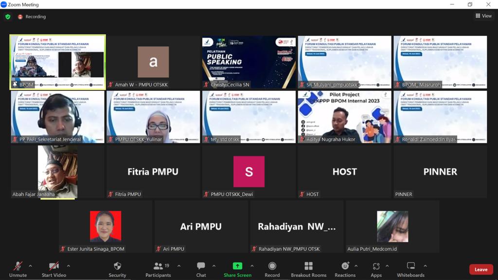 Bekasi, 19 Juni 2023 – Sebagai wujud komitmen dalam mengimplementasikan Undang-Undang Nomor 25 Tahun 2009 tentang Pelayanan Publik, Direktorat Pemberdayaan Masyarakat dan Pelaku Usaha Obat Tradisional, Suplemen Kesehatan dan Kosmetik yang merupakan Unit Pelayanan Publik di Badan Pengawas Obat Dan Makanan sesuai dengan Peraturan BPOM Nomor 28 Tahun 2022 tentang Pelayanan Publik di Lingkungan Badan Pengawas Obat dan Makanan melakukan Forum Konsultasi Publik Standar Pelayanan Publik Direktorat Pemberdayaan Masyarakat dan Pelaku Usaha Obat Tradisional.