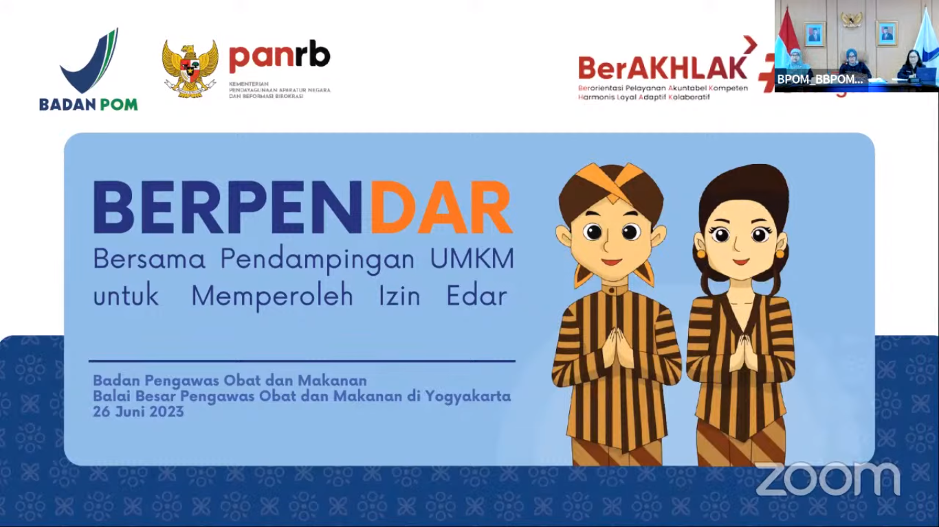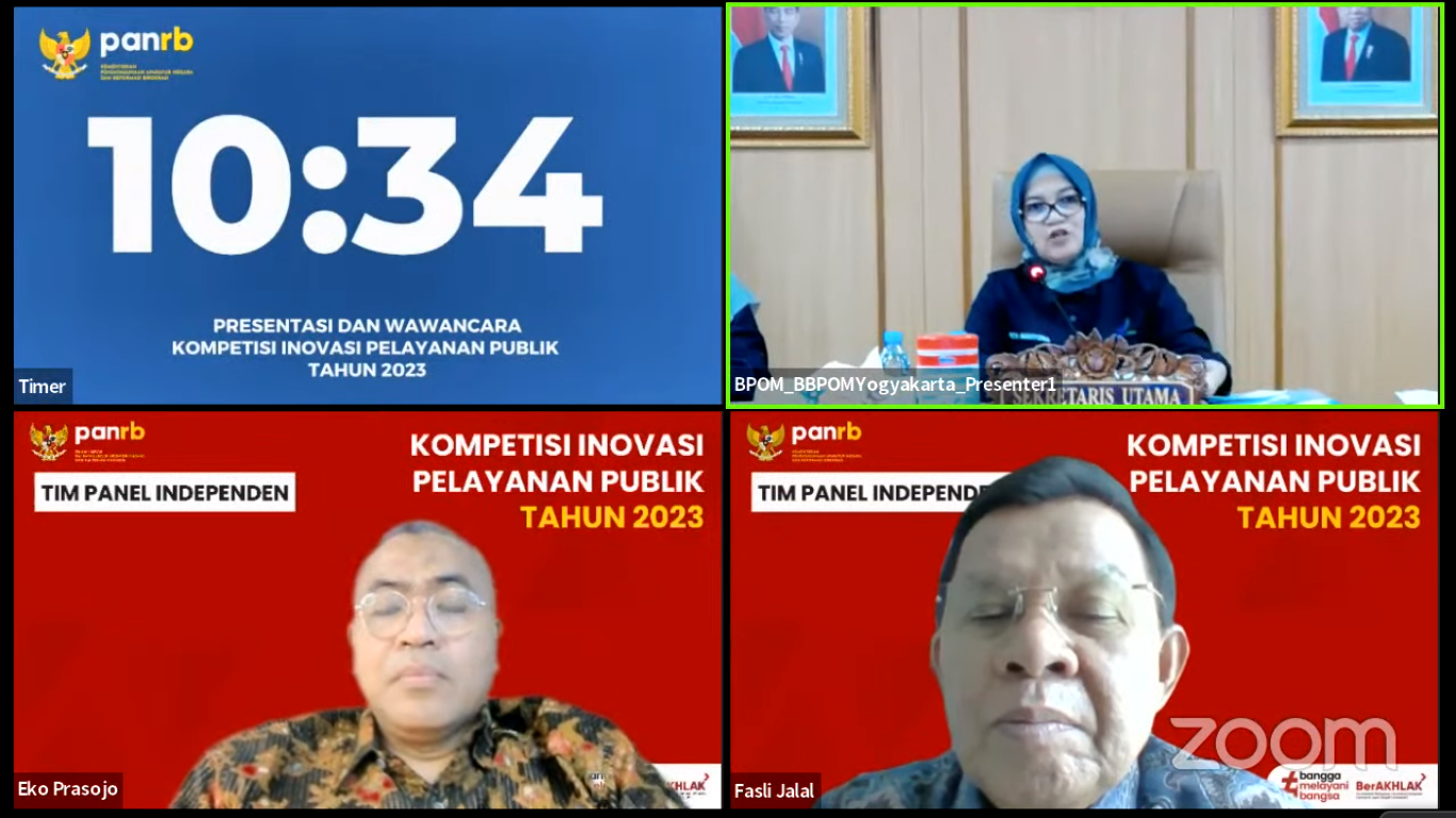 Senin (26/06/2023), Sekretaris Utama BPOM, Rita Mahyona memaparkan inovasi dari BBPOM di Yogyakarta yang disebut dengan BERPENDAR (Bersama Pendampingan UMKM Untuk Memperoleh Izin Edar) pada kegiatan Presentasi dan Wawancara Kompetisi Inovasi Pelayanan Publik (KIPP) Tahun 2023 yang dilaksanakan via online. Plt. Kepala BBPOM di Yogyakarta sekaligus Kepala Bagian Tata Usaha BBPOM Yogyakarta, Ani Fatimah Isfarjanti; serta Pengawas Farmasi dan Makanan (PFM) Ahli Muda BBPOM Yogyakarta, Ratna Widi Astuti turut mendampingi dalam kegiatan tersebut. Bertindak sebagai tim panel independen pada KIPP, antara lain Nurjaman Mochtar, Tulus Abadi, Fasli Jalal, Indah Sukmaningsih, dan Dadan S. Suharmawijaya, dengan dimoderatori oleh Eko Prasojo.