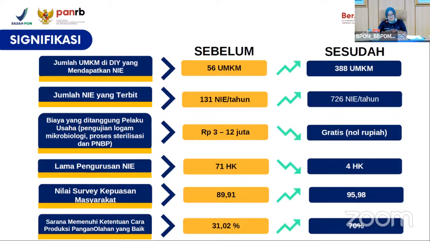 “Inovasi BERPENDAR mampu menyinergikan serta mengolaborasikan kegiatan dan pendanaan berbagai komponen lintas sektor, serta dapat mendorong laju pertumbuhan pendaftaran NIE pangan olahan, sekaligus mendorong perekonomian di wilayah Yogyakarta,” ucap Rita Mahyona mengawali paparannya.