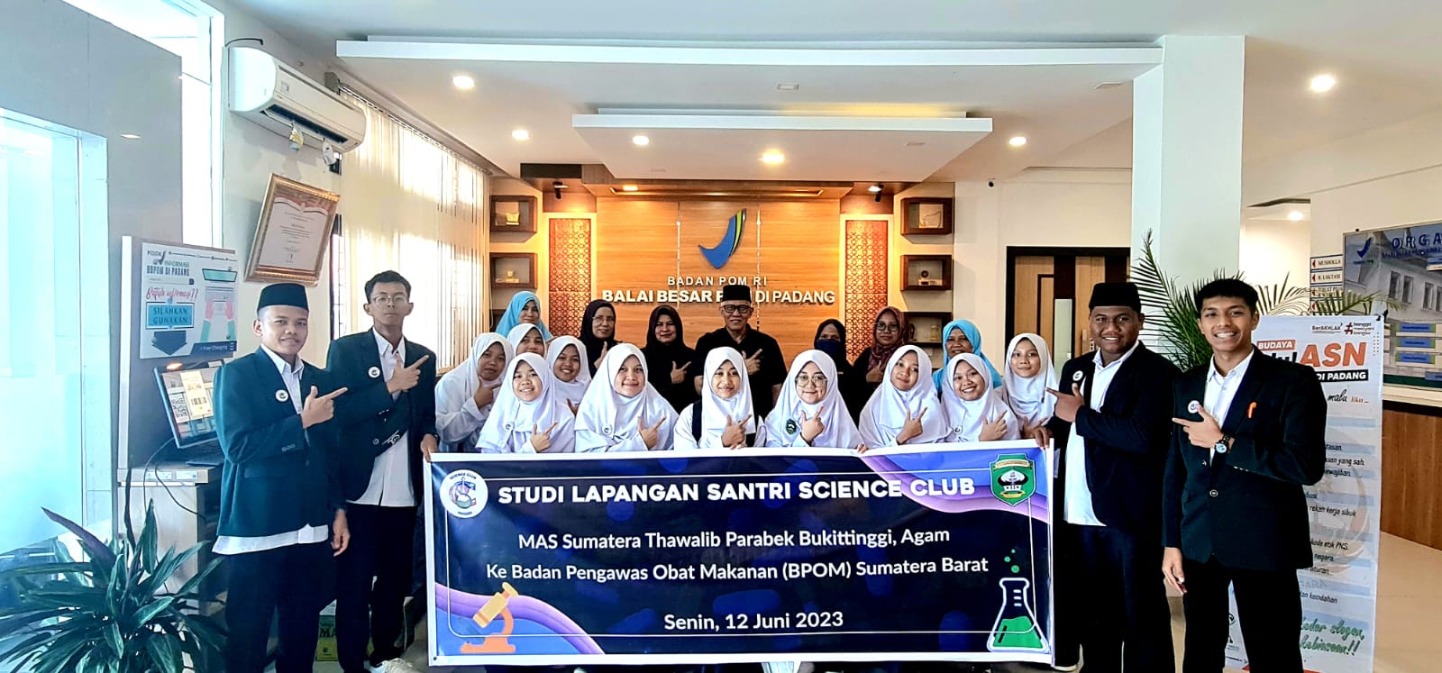 PADANG.Galamai, –“Para siswa sangat antusias mendengarkan informasi yang disampaikan selama kunjungan ke BBPOM di Padang, banyak pengetahuan yang diperoleh, dan menambah wawasan” ujar Elya Sastra selaku guru pendamping Science Club Madrasah Aliyah Sumatera (MAS) Thawalib Parabek-Agam yang datang mengunjungi Balai Besar Pengawas Obat dan Makanan (BBPOM) di Padang, Senin (12/6). Rombongan disambut langsung oleh Kepala BBPOM di Padang, Abdul Rahim beserta tim.