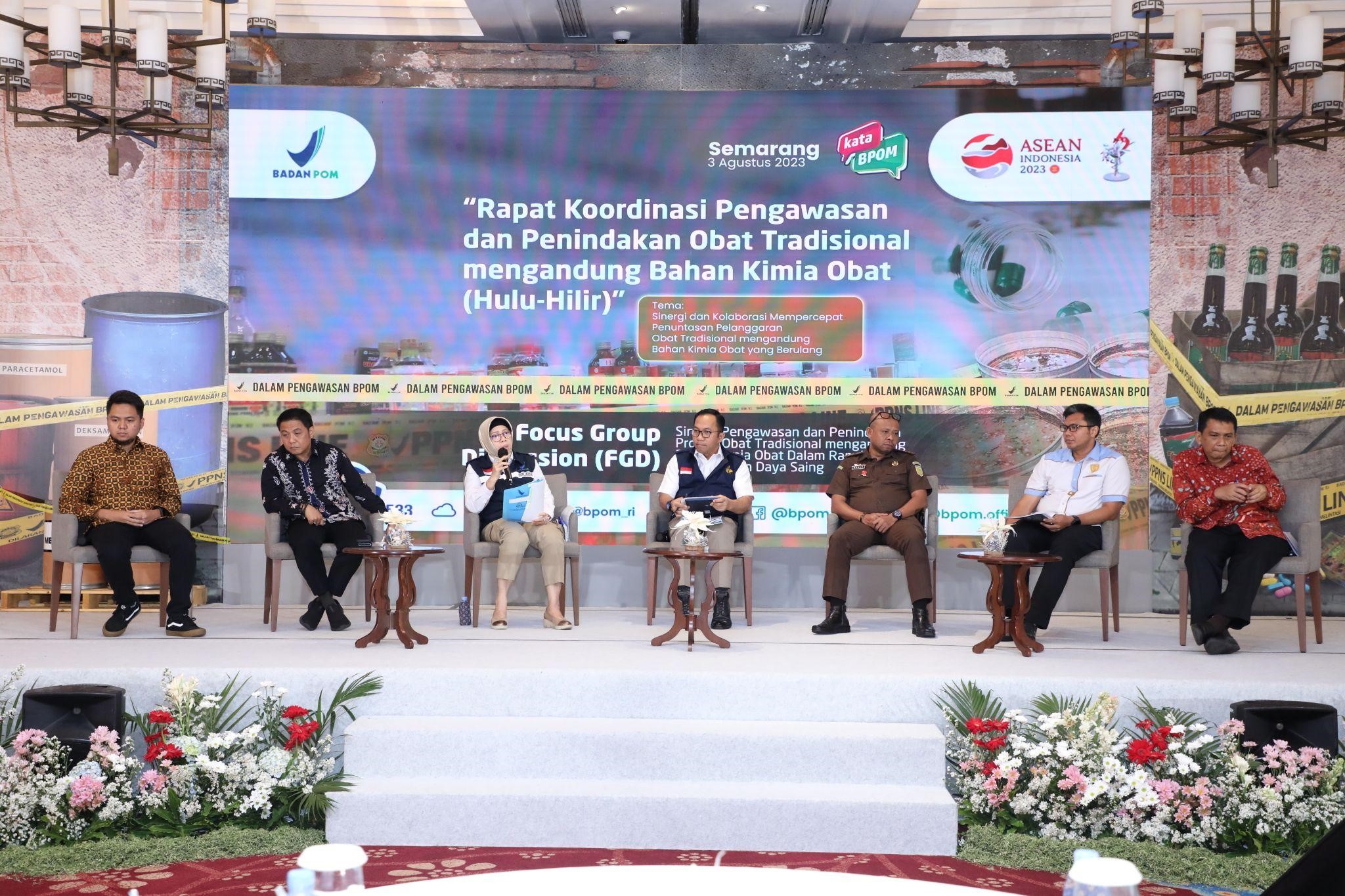 Semarang - Sebagai upaya menyinergikan kolaborasi lintas stakeholders dalam kerangka pencegahan dan pemberantasan obat tradisional mengandung bahan kimia obat (OT BKO), BPOM bersama lintas sektor menggelar Rapat Koordinasi Pengawasan-Penindakan Obat Tradisional Mengandung Bahan Kimia Obat (Hulu–Hilir), Kamis (03/08/2023). Rapat koordinasi ini bertujuan memperkuat kolaborasi multihelix seluruh pemangku kepentingan, yaitu pemerintah, penegak hukum, pelaku usaha, pakar/akademisi, masyarakat, dan media dalam pencegahan dan pemberantasan OT BKO agar semakin efektif.