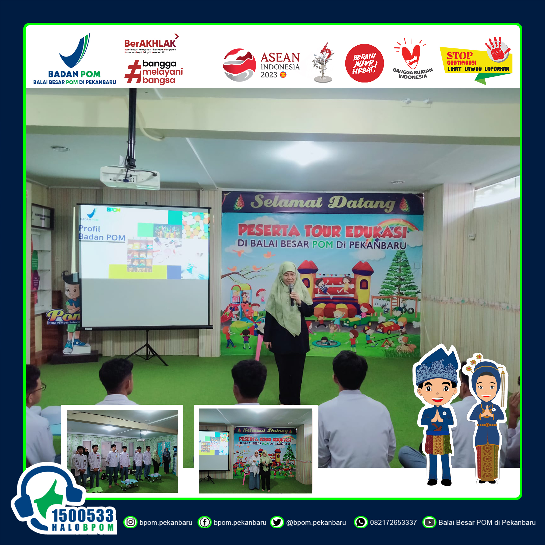 Tanggal 08 Mei 2023 di Ruang Ramah Anak, tim Infokom Balai Besar POM di Pekanbaru menerima kunjungan tur edukasi MA Arsyad. Kepada siswa dan guru diberikan materi tentang Profil Badan POM, Keamanan Pangan dan cek KLIK. Pemberian materi diselingi dengan tanya jawab dan pemberian gimmick kepada siswa yang dapat menjawab pertanyaan dengan benar.