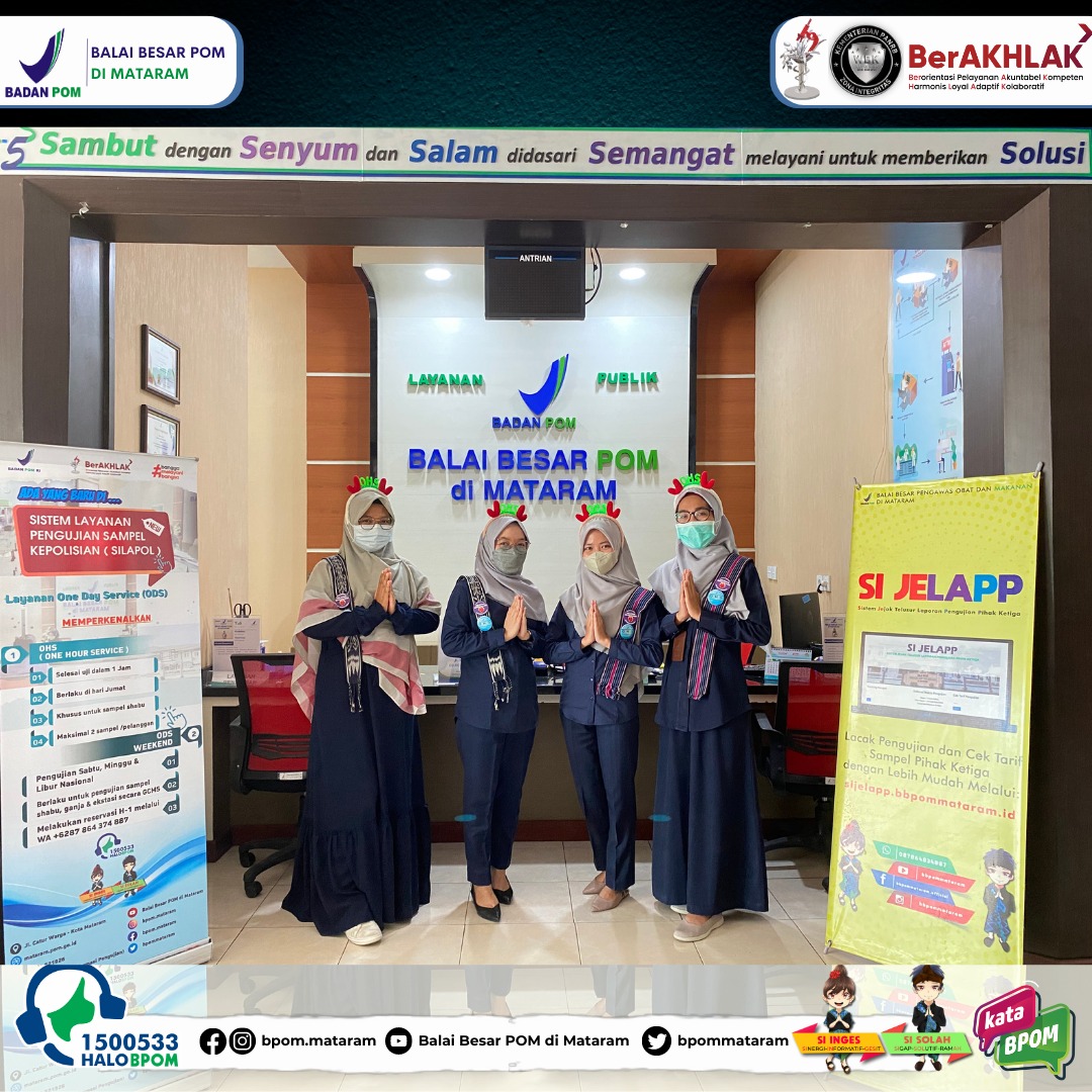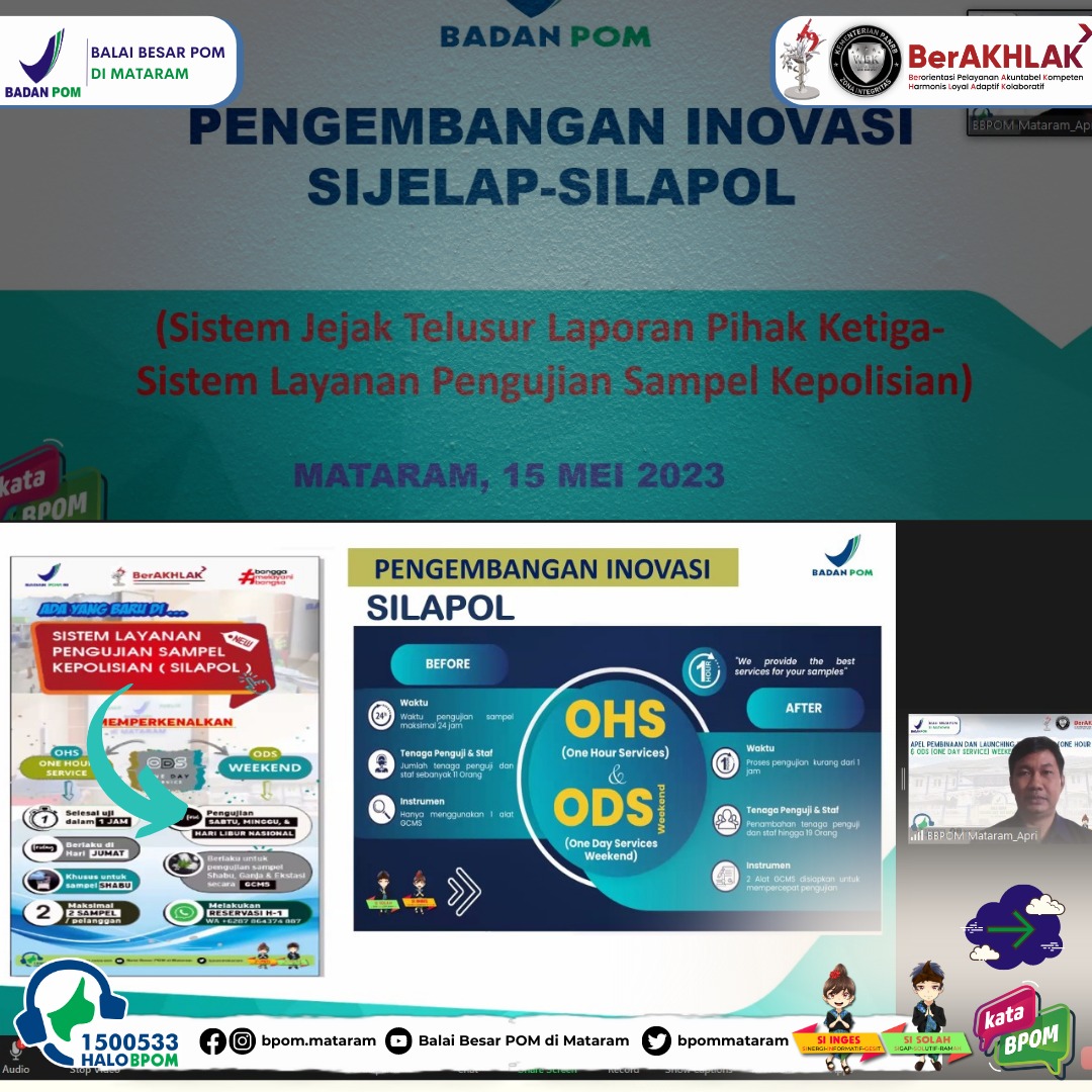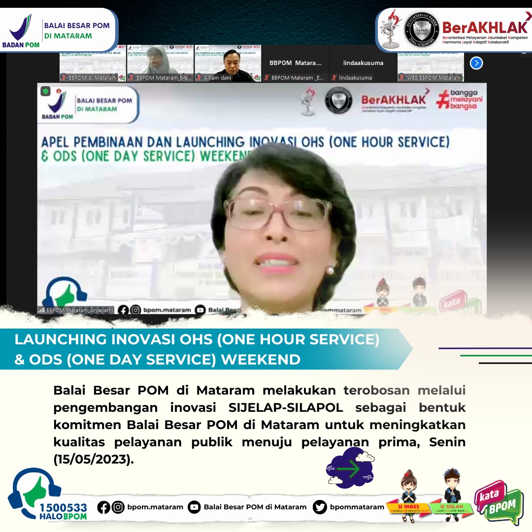 Mataram - Senin (15/05/2023) Sebagai satuan kerja yang memiliki komitmen untuk mewujudkan WBK dan WBBM melalui Reformasi Birokrasi, khususnya dalam hal peningkatan kualitas pelayanan publik menuju pelayanan prima, Balai Besar POM di Mataram melakukan terobosan melalui pengembangan inovasi ODS (One Day Service). ODS adalah layanan pengujian pihak ketiga atau eksternal khususnya sampel obat dan NAPPZA yang selesai uji dalam waktu 1 (satu) hari dan telah berjalan sejak tahun 2021. Launching pengembangan inovasi ini dibuka oleh Kepala Balai Besar POM di Mataram, Dra. I Gusti Ayu Adhi Aryapatni, Apt, dan dihadiri oleh seluruh ASN Balai Besar POM di Mataram secara virtual.