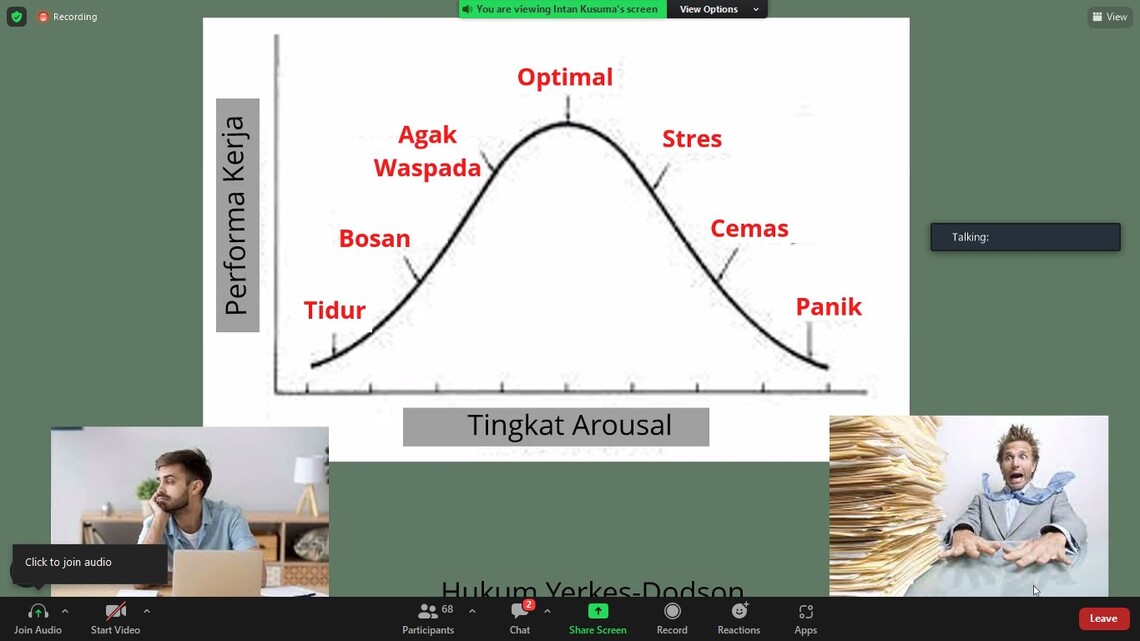 Narasumber pada kegiatan Jumat Manis, Intan Kusuma Wardhani, seorang psikolog yang menyampaikan bahwa motivasi akan mempengaruhi performa kerja. Performa kerja turun ketika tidak ada dorongan untuk mengerjakan sesuatu (arrousel), tetapi bila ada tantangan atau masalah (yang proporsional) yang harus dihadapi, performa kerja akan lebih optimal.