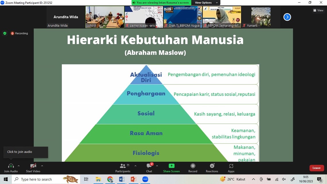 YOGYAKARTA. Kau bisa patahkan kakiku, Tapi tidak mimpi-mimpiku, Kau bisa lumpuhkan tanganku, Tapi tidak mimpi-mimpiku. Manusia -manusia kuat itu kita, Jiwa-jiwa yang kuat itu kita. Lirik lagu “Manusia Kuat ” terasa bermakna saat diresapi pada pembukaan kegiatan Parade Jumat Manis yang diselenggarakan oleh AOC BBPOM di Yogyakarta pada hari Jumat (16/06/2023). Kegiatan AOC dengan tema “Bangkitkan Motivasi Diri, Terus Bersinar dalam Karya”, diikuti secara hybrid oleh seluruh karyawan BBPOM di Yogyakarta dan dari unit teknis lain, antara lain BBPOM di Palembang, Semarang, Banda Aceh dan Lampung.