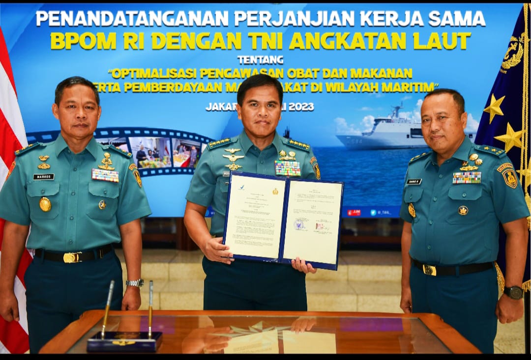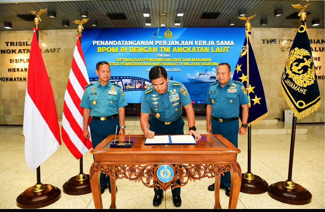 Jakarta - BPOM bersama Tentara Nasional Indonesia Angkatan Laut (TNI AL) menandatangani perjanjian kerja sama tentang "Optimalisasi Pengawasan Obat dan Makanan serta Pemberdayaan Masyarakat di Wilayah Maritim" di Jakarta. Penandatanganan ini dilakukan secara desk to desk oleh Kepala BPOM, Penny K. Lukito di kantor BPOM pada Selasa (04/07/2023) dan Kepala Staf Angkatan Laut Laksamana TNI, Muhammad Ali di Markas Besar Angkatan Laut pada Kamis (06/07/2023).