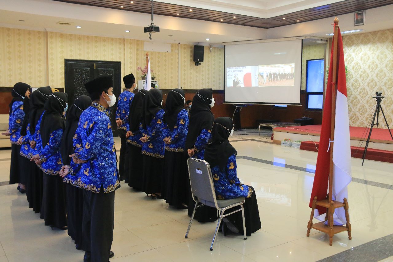 Padang. Galamai – Bertempat di aula lantai 3, pada hari ini, Kamis, 11 Mei 2023, telah dilaksanakan upacara pengambilan sumpah PNS dan pelantikan pejabat fungsional terhadap 12 orang pegawai BBPOM di Padang. Upacara berlangsung secara terpusat di Badan POM dan dipimpin langsung oleh Kepala Badan POM, Penny K. Lukito dan dilaksanakan secara hybrid dengan seluruh UPT Badan POM di seluruh Indonesia. Disaksikan oleh Kepala BBPOM di Padang dan Kabag Tata Usaha, 6 orang CPNS pengangkatan tahun 2022 dan 6 orang pejabat fungsional BBPOM di Padang mengikuti upacara tersebut secara daring melalui Zoom Cloud Meeting.