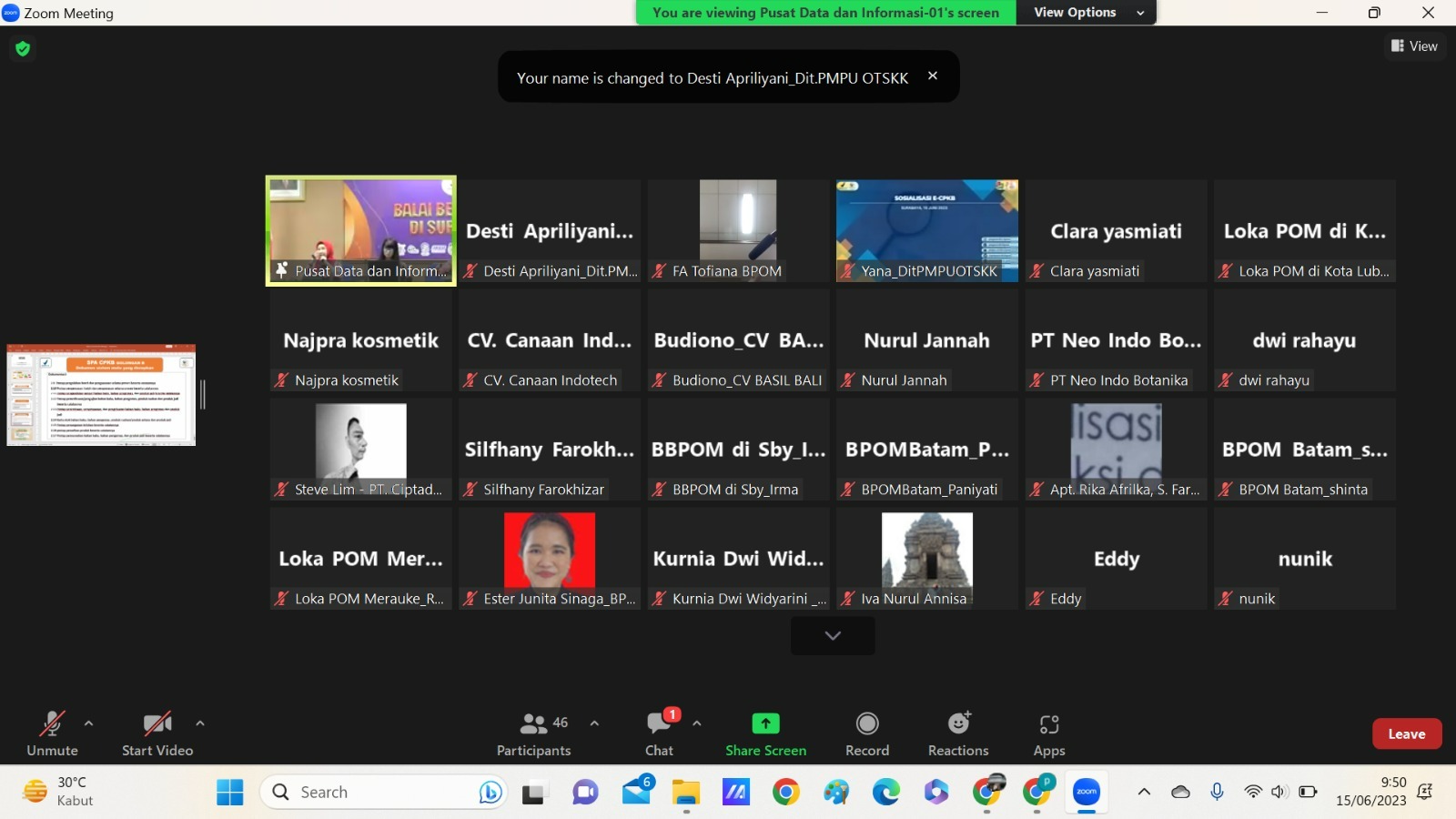 Surabaya - Pada Kamis (15/06/2023), Direktorat Pemberdayaan Masyarakat dan Pelaku Usaha Obat Tradisional Suplemen Kesehatan dan Kosmetik menyelenggarakan kegiatan Sosialisasi aplikasi e-CPKB kepada pelaku usaha kosmetik di BBPOM Surabaya. Kegiatan ini dihadiri oleh beberapa pelaku usaha di wilayah Surabaya sekitarnya (luring) serta beberapa fasilitator pendampingan UMKM Kosmetik di UPT BPOM secara daring (zoom meeting).