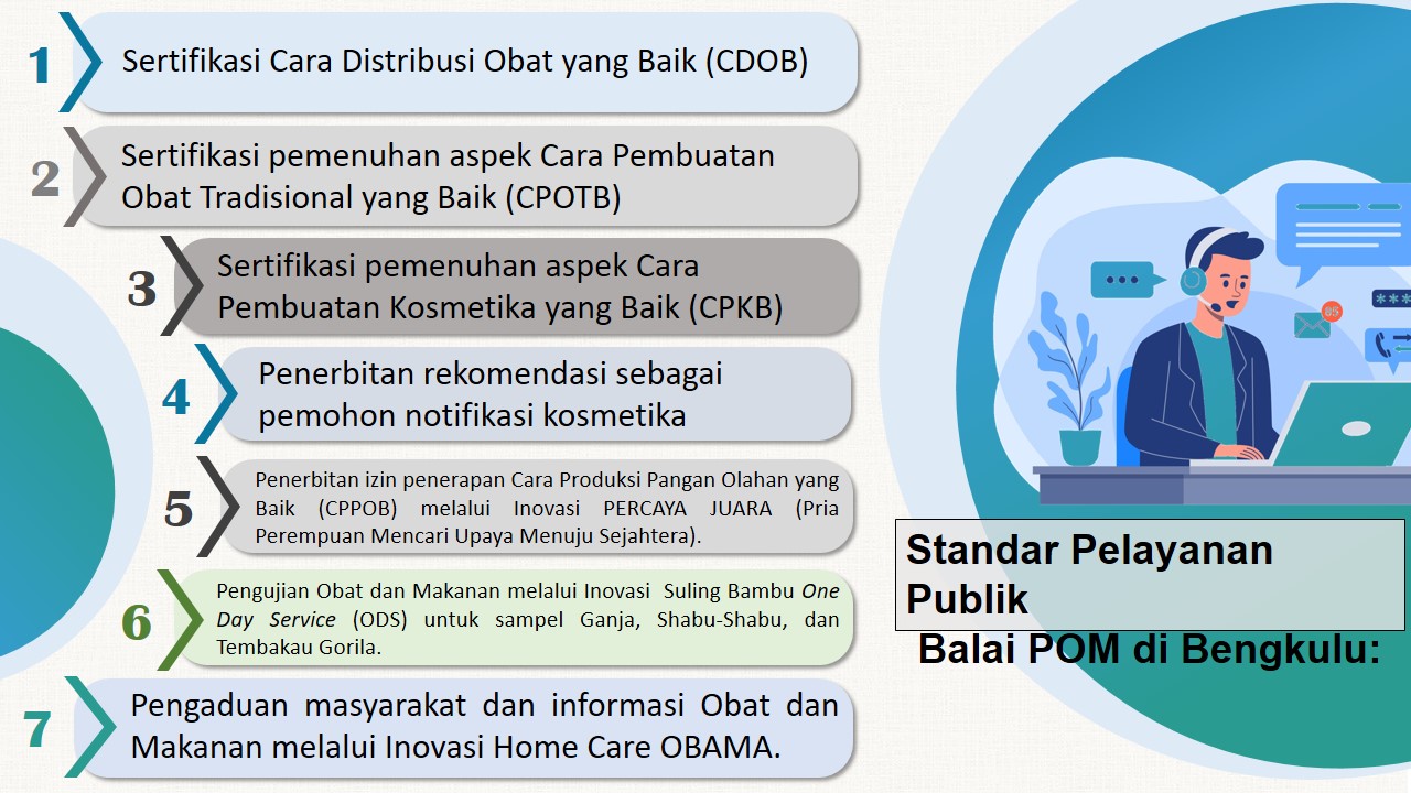 Balai POM di Bengkulu memberikan 7 jenis layanan bagi masyarakat sebagaimana tercantum dalam Standar Pelayanan Publik Balai POM di Bengkulu No. HK.02.02.7A.7A4.04.23.73 Tahun 2023. File Standar Pelayanan Publik dapat diakses pada subsite BPOM Bengkulu melalui link https://bit.ly/SPPBPOMBengkulu.