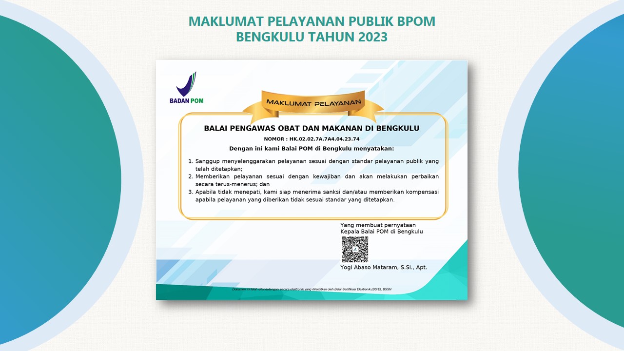 Dalam memberikan pelayanan, Balai POM di Bengkulu memiliki maklumat pelayanan untuk menyelenggarakan pelayanan sesuai standar dan kewajiban serta melakukan perbaikan terus-menerus. Jika tidak menepati maka Balai POM di Bengkulu siap menerima sanksi dan/atau memberikan kompensasi.