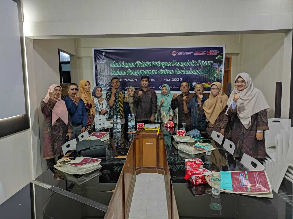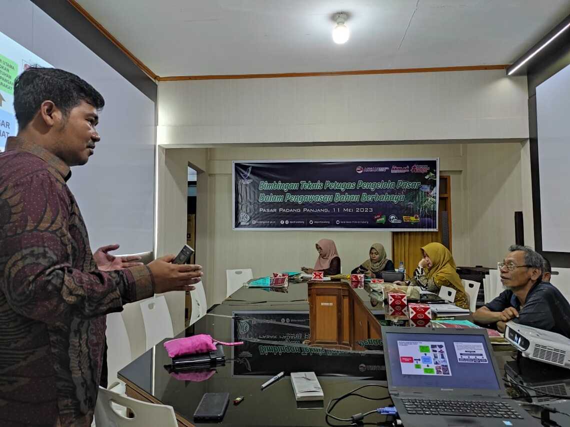 PADANG PANJANG.Galamai,- Ruangan aula lantai dua Kantor Pasar Padang Panjang dengan meja bundar yang lengkap dengan kursi dipenuhi oleh petugas dan perwakilan pedagang pasar yang hadir untuk mengikuti Bimbingan Teknis (Bimtek) bagi petugas pengelola pasar dalam pengawasan bahan berbahaya, Kamis (11/5). Kegiatan ini dilaksanakan oleh Balai Besar Pengawas Obat dan Makanan (BBPOM) di Padang yang merupakan salah satu rangkaian dari program Pasar Pangan Aman Berbasis Komunitas (PPABK) yang menjadi program prioritas nasional.