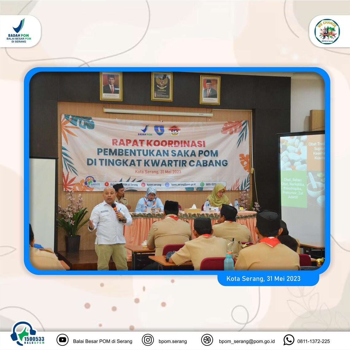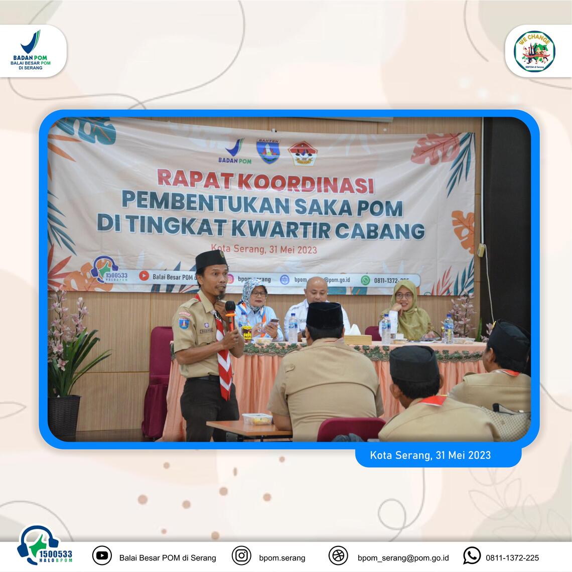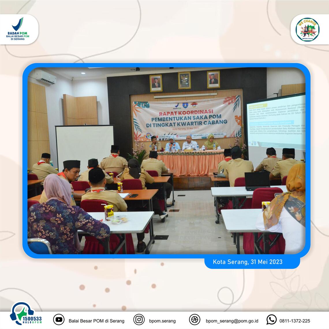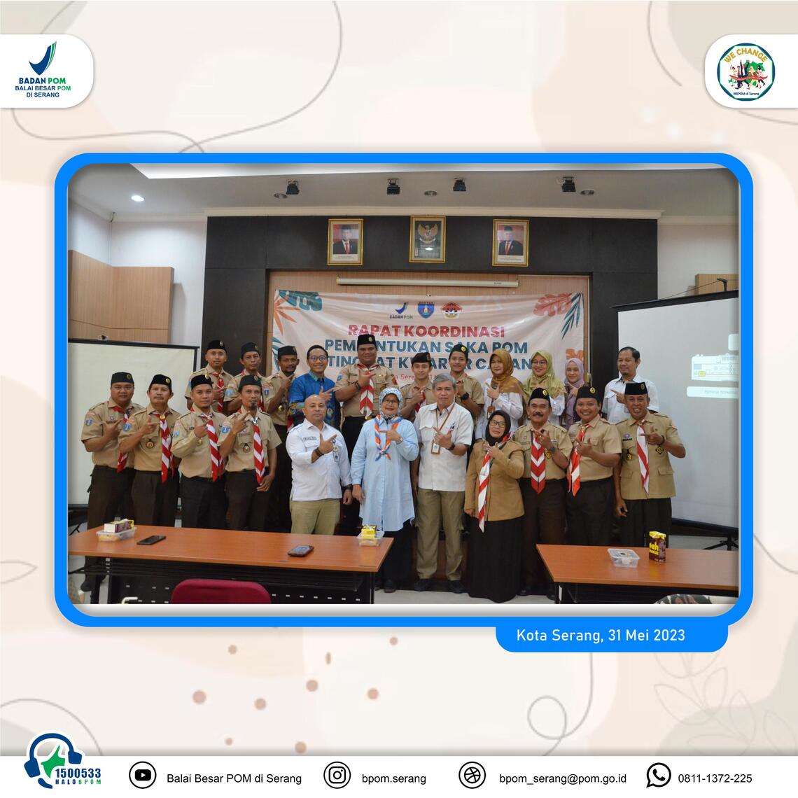 >Serang - Balai Besar POM di Serang menggelar rapat koordinasi pembentukan Saka POM di tingkat cabang pada Rabu (31/05/2023) lalu. Rapat yang bertempat di Kantor Balai Besar POM di Serang ini bertujuan untuk membentuk kelembagaan Mabisaka dan Pimpinan Saka POM di setiap kwartir cabang di Banten dan menumbuhkan pangkalan Saka di setiap kwartir cabang/kwartir ranting di Banten sebagai wadah pembinaan generasi muda yang berminat di bidang Pengawasan Obat dan Makanan.