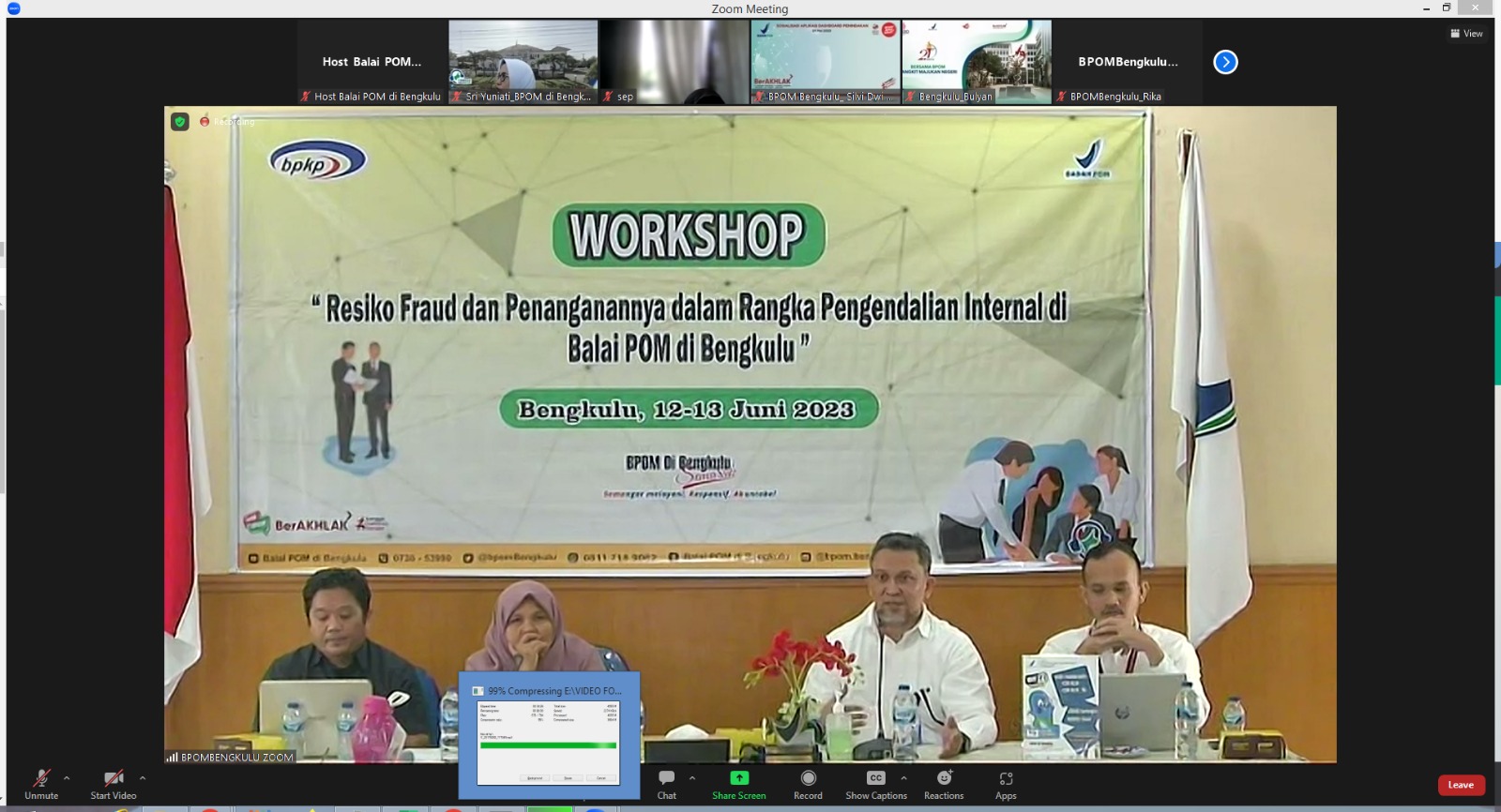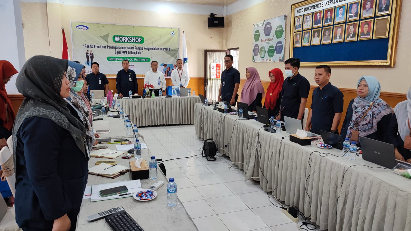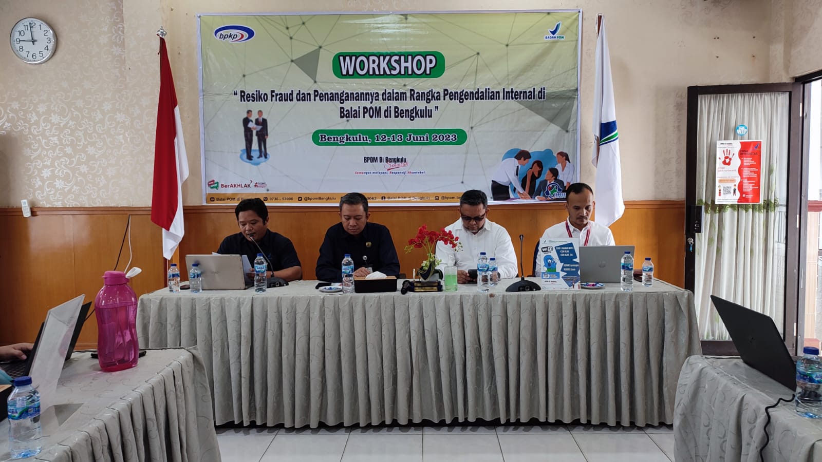 Bengkulu, 12-13 Juni 2023 Balai POM di Bengkulu menyelenggarakan Workshop “Resiko Fraud dan Penanganannya dalam rangka Sistem Pengendalian Internal BPOM Bengkulu” di Aula kantor Balai POM di Bengkulu yang beralamat di Jl. Depati Payung Negara, Pekan Sabtu Kota Bengkulu. Kegiatan diikuti 35 orang peserta Luring dan sebagian lainnya melalui Zoom Meeting. Acara dibuka langsung oleh Kepala BPOM Bengkulu, Yogi Abaso Mataram, S.Si., Apt. Mengundang narasumber dari Badan Pengawasan Keuangan dan Pembangunan (BPKP) di hari pertama oleh Dedy Yudistira dan Ricko Pratama dengan materi “Resiko Fraud secara umum, lalu Penerpan dan Pengelolaan Resiko Fraud pada BPKP Bengkulu serta Review Dokumen FCP Balai POM Bengkulu. Narasumber di hari ke 2 (Dua) oleh Untung Widodo dan Ricko Pratama dengan materi yang yang disampaikan yaitu “ Review Dokumen lanjutan FCP Balai POM Bengkulu” dan materi ke-2 “Pembuatan Dokumen FCP Balai POM Bengkulu”