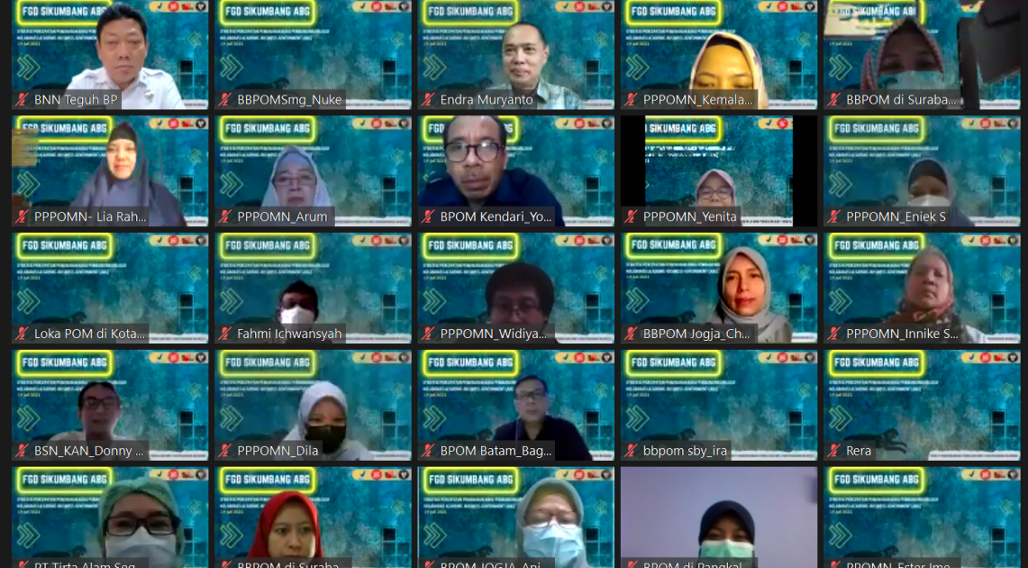 Langkah awal upaya internalisasi dan penggalangan komitmen dari para stakeholder dilakukan melalui Focus Group Discussion (FGD) pada hari Senin, 19 Juli 2021 sebagai wujud nyata aksi perubahan SIKUMBANG ABG. Acara dibuka langsung oleh Sekretaris Utama, Elin Herlina dan dihadiri oleh 414 peserta secara daring antara lain dari Academic yaitu Prof. Dr. Apt. Slamet Ibrahim S., DEA dari ITB, Prof. Dr. rer nat Muhammad Yuwono, MS dari Unair, Prof. Dr. Apt. Sudibyo Martono, MS dari UGM, serta dari pihak Business antara lain PT. SIG Lab, PT. Kalbe Farma, PT. BVAQ Indonesia dan perwakilan dari Government yaitu BRIN, BPPT, LIPI, BSN-KAN, BNN, PUSLABFOR, LITBANGKES, dan Biro Kerjasama dan Humas BPOM yang memberikan tanggapan terkait kemungkinan MoU atau Perjanjian Kerjasama (PKS).