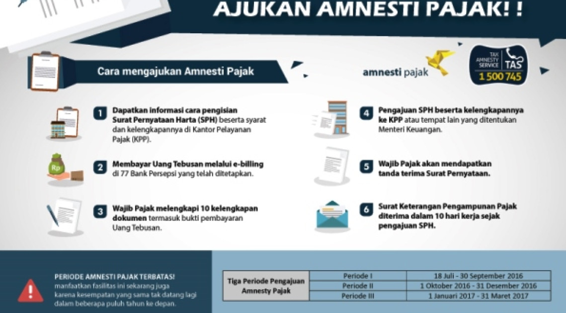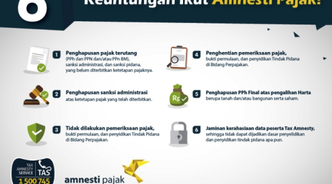 Untuk informasi lebih lanjut, kunjungi www.pajak.go.id/amnestipajak atau telepon hotline Amnesti Pajak di 1500745 (Kerjasama Biro Komunikasi dan Layanan Informasi/BKLI, Direktorat P2Humas dan Tim Komunikasi Pemerintah/TKP)