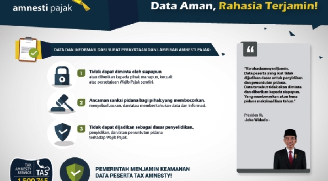 Amnesti Pajak membutuhkan orang-orang yang berjiwa besar untuk mengungkap harta yang selama ini mungkin lupa dilaporkan dalam Surat Pemberitahuan (SPT) Tahunan. Hal ini bukanlah sebuah tindakan bodoh dan sia-sia karena pengungkapan ini dilindungi Undang-Undang. Data yang diungkap ada jaminan tidak akan diperiksa kembali dan adanya kepastian hukum dari sisi perpajakan melalui Surat Keterangan Pengampunan Pajak.