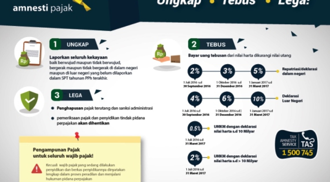 Amnesti Pajak peluang terakhir untuk menebus kesalahan, karena hanya diberi kesempatan hingga 31 Maret 2017. Jika data yang masih disembunyikan terungkap maka akan dilakukan proses tindakan perpajakan sesuai ketentuan yang berlaku dan pengenaan sanksi kenaikan berupa denda 200% dari Pajak Penghasilan yang tidak atau kurang dibayar.