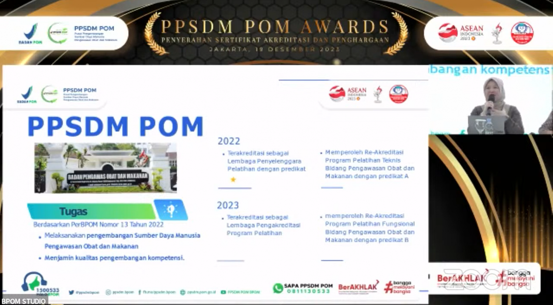 Jakarta – BPOM menggelar kegiatan “BPOM Award, Penyerahan Sertifikat Akreditasi dan Penghargaan” di Aula Gedung Merah Putih, Selasa (19/12/2023). Awarding ini digelar untuk memberi apresiasi bagi pihak-pihak yang telah membantu BPOM dalam meningkatkan kompetensi sumber daya manusia (SDM) dalam pengawasan obat dan Makanan di seluruh Indonesia. Juga untuk melakukan sosialisasi terkait program pelatihan teknis penyuluh keamanan pangan (PKP) pertama dan District Food Inspector (DFI) Junior di tahun 2024.