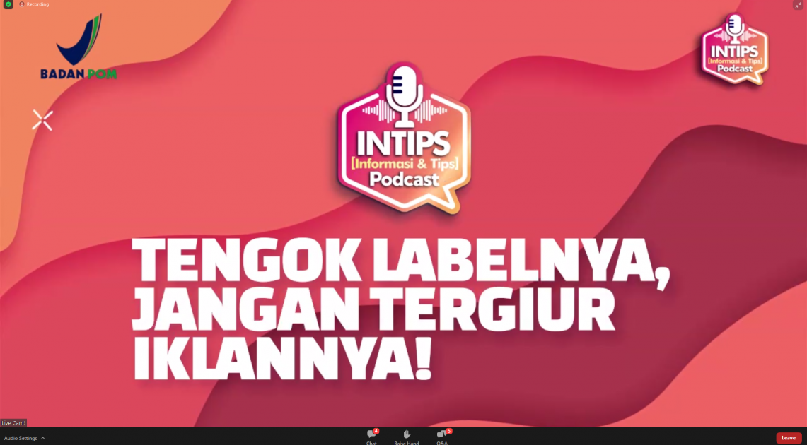 INTIPS sendiri merupakan seri podcast yang rutin dilakukan oleh Badan POM untuk memberikan informasi, serta meningkatkan pengetahuan masyarakat dalam memilih obat dan makanan yang aman melalui media audio visual secara daring. Podcast kali ini dihadiri oleh ratusan peserta yang terdiri dari masyarakat umum, perwakilan organisasi, komunitas ibu, kader PKK, influencer/blogger, generasi milenial, dll.