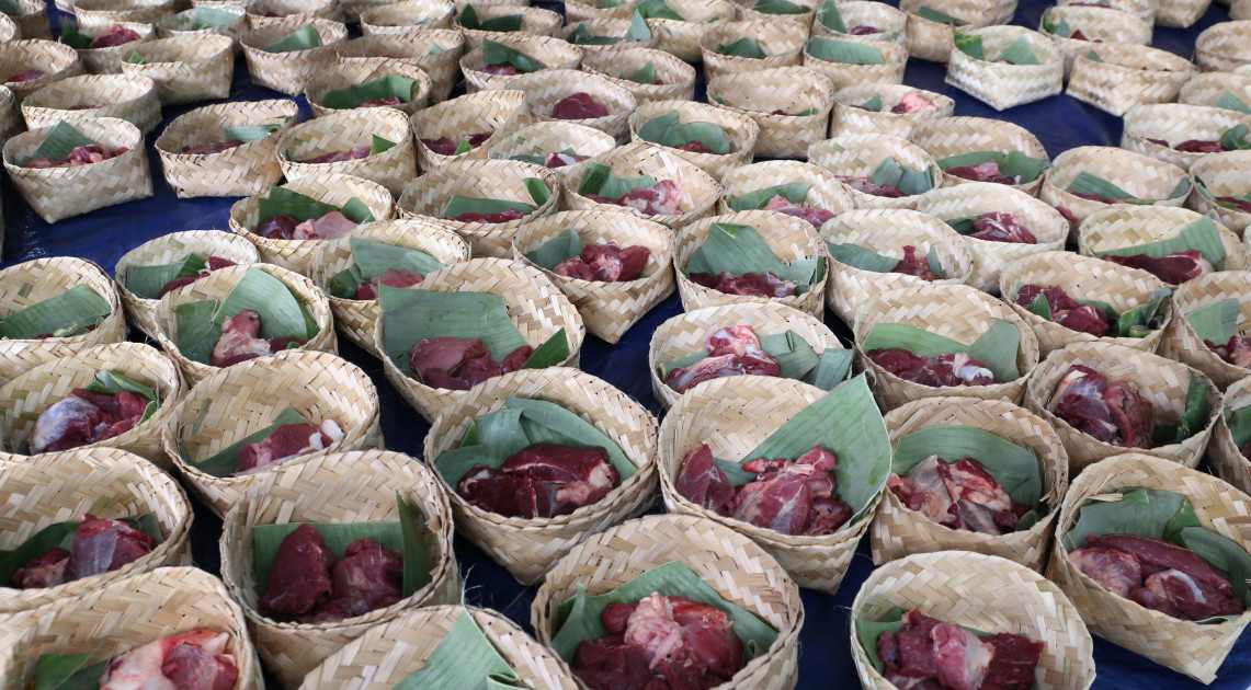 Daging qurban yang telah dipotong dimasukkan ke dalam besek bambu beralaskan daun pisang, dan disalurkan kepada ratusan mustahiq yang telah mendapatkan kupon jauh hari sebelum pelaksanaan penyembelihan. Harapannya agar dapat disalurkan kepada masyarakat yang berhak sebagai bentuk rasa syukur dan ketaqwaan mendekatkan diri kepada Allah, Tuhan YME. (HM-Rizky)