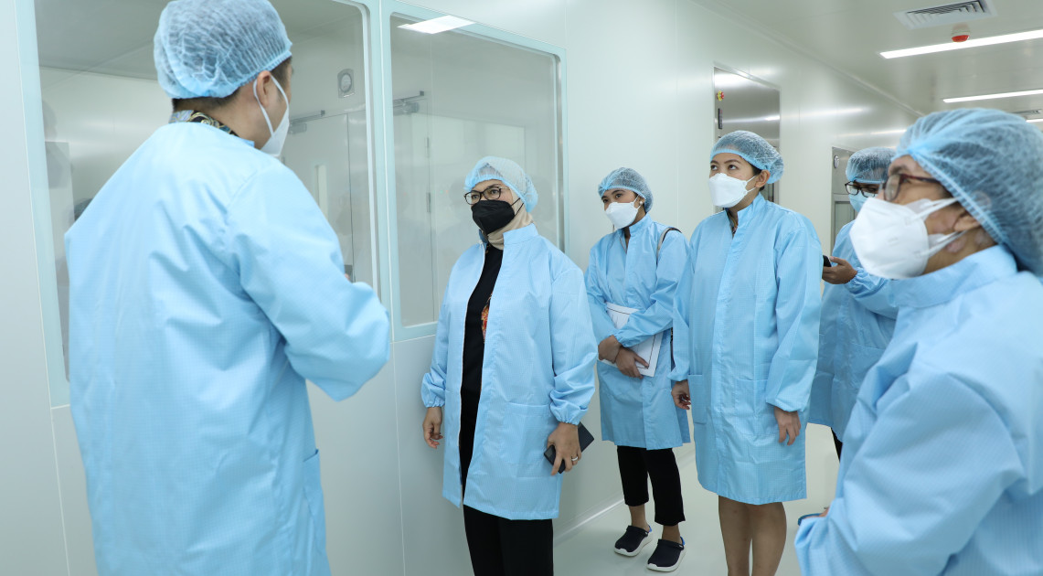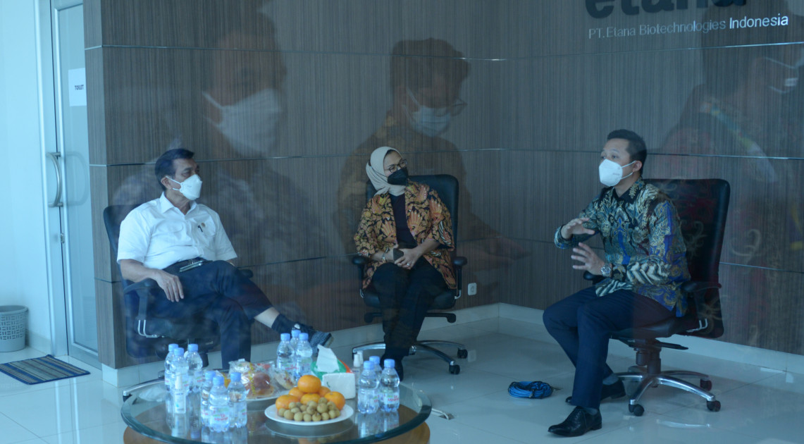 Jakarta – Senin (07/09), Kepala Badan POM RI, Penny K. Lukito mengunjungi fasilitas produksi (fill & finish) PT Etana Biotechnologies Indonesia (PT Etana). Kunjungan ini dilakukan dalam rangkaian kunjungan kerja Menteri Koordinator Bidang Kemaritiman dan Investasi, Luhut Binsar Pandjaitan, yang turut pula dihadiri oleh Wakil Menteri Kesehatan RI, Dante Saksono.