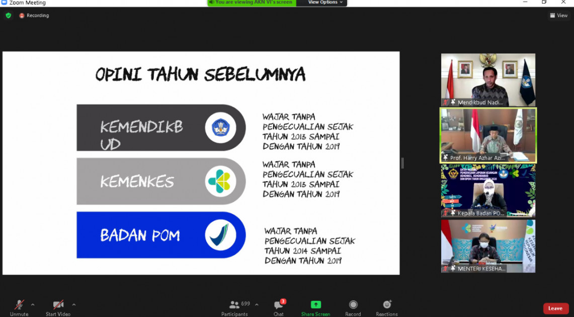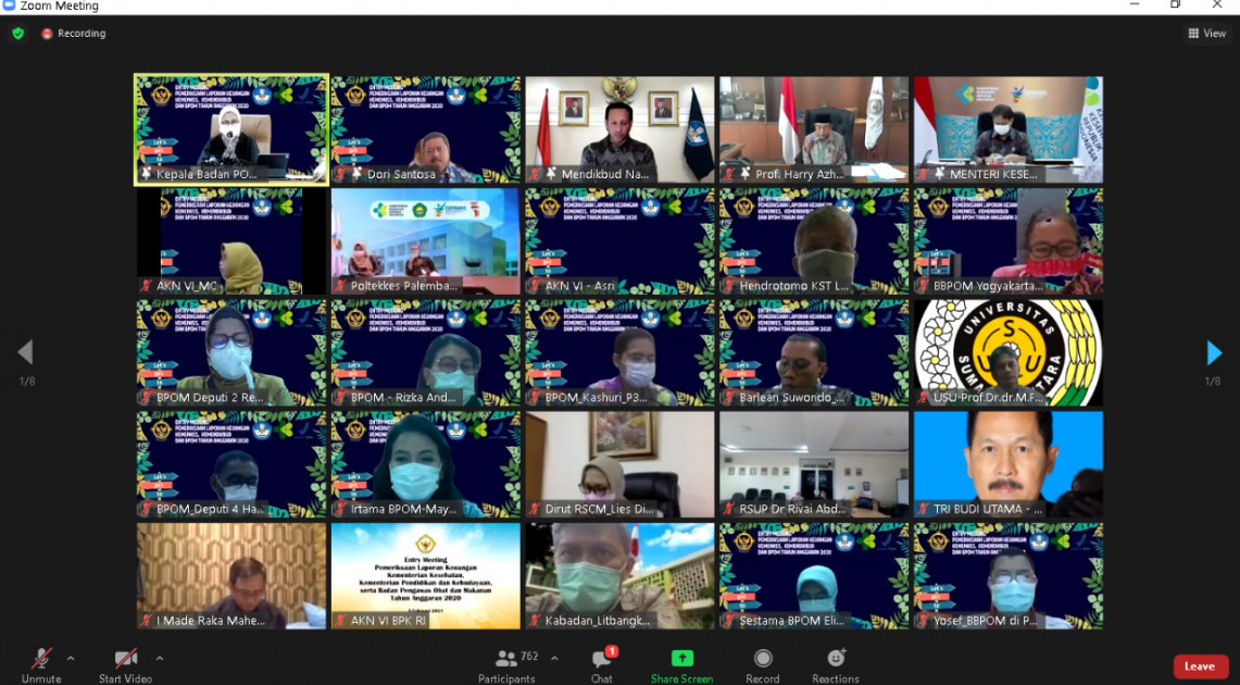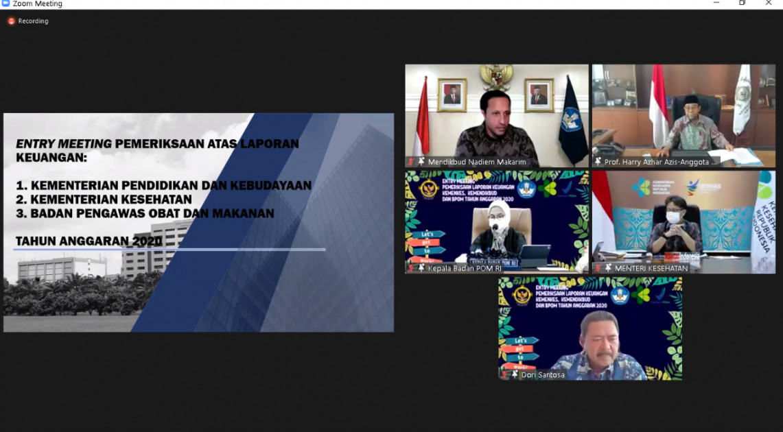 Jakarta – Kepala Badan POM RI, Penny K. Lukito menghadiri Entry Meeting Pemeriksaan Laporan Keuangan Kementerian/Lembaga (K/L) Tahun Anggaran 2020 pada Entitas di Lingkungan Auditoriat Keuangan Negara (AKN) VI bersama dengan Anggota VI Badan Pemeriksa Keuangan (BPK) Harry Azhar Azis, Menteri Pendidikan dan Kebudayaan Nadiem Makarim, dan Menteri Kesehatan Budi Sadikin, Jumat (05/02) secara daring melalui Zoom.