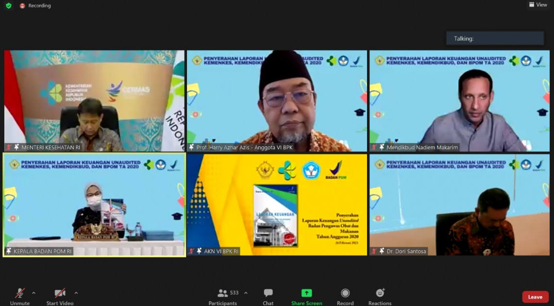 Kepala Badan POM menyampaikan bahwa Anggaran Belanja Badan POM TA 2020 digunakan untuk mendukung pencapaian Visi Presiden yang menitikberatkan pada pembangunan Sumber Daya Manusia, dan pada tahun yang sama, Badan POM melakukan refocusing anggaran untuk mendukung penanganan COVID-19, dan realisasinya mencapai 97,45%.