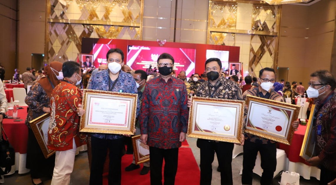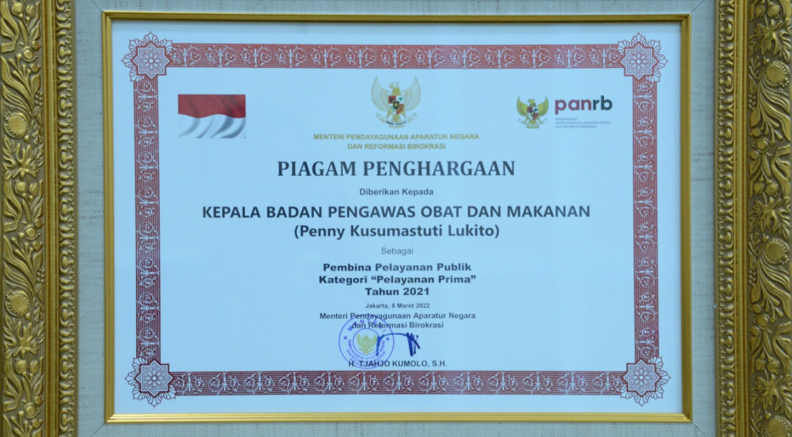 Penghargaan tersebut diserahkan secara langsung oleh Menteri PANRB, Tjahjo Kumolo kepada Kepala Badan POM RI, Penny K Lukito yang pada kesempatan tersebut diwakilkan kepada Plt. Sekretaris Utama Badan POM, I Gusti Ngurah Bagus Kusuma Dewa, Selasa (08/03/2022). Acara ini juga dihadiri oleh para Menteri Kabinet Indonesia Maju, pimpinan kementerian/lembaga, dan kepala daerah.