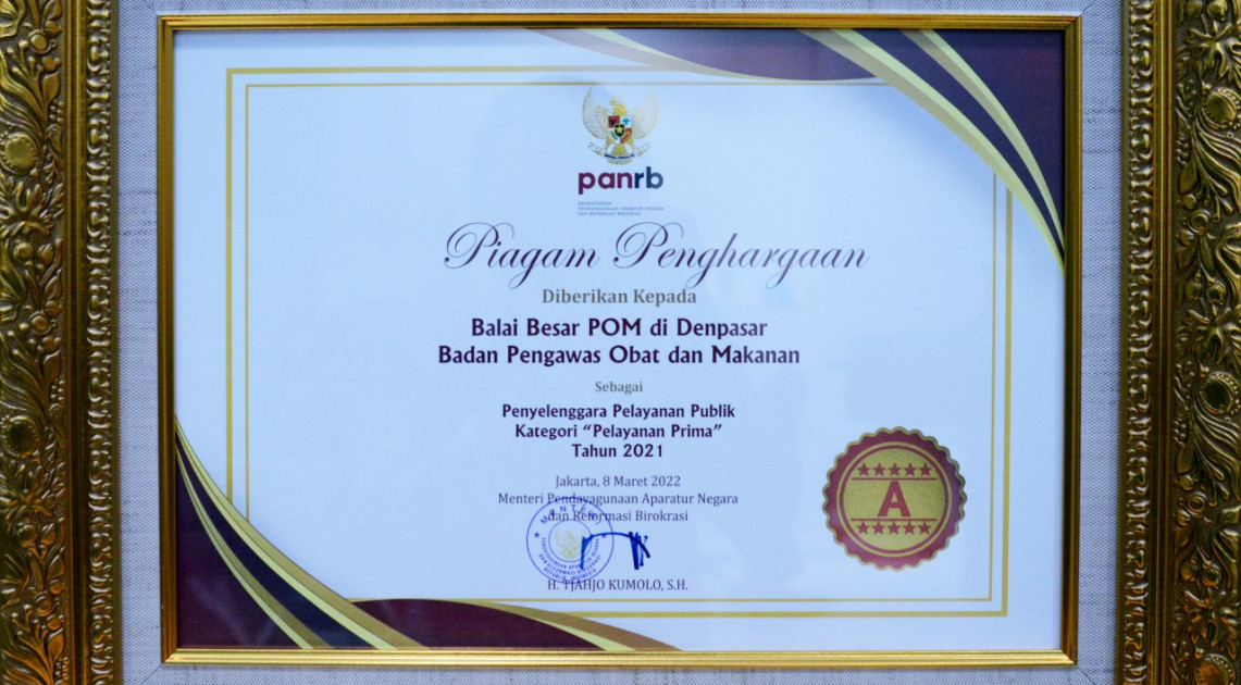 Jakarta – Kepala Badan POM berhasil meraih penghargaan sebagai Pembina Pelayanan Publik Kategori Pelayanan Prima Lingkup Kementerian/Lembaga Tahun 2021. Penghargaan lain yang diterima adalah Penyelenggara Pelayanan Publik Kategori Pelayanan Prima Tahun 2021 dengan Predikat A yang diperoleh Balai Besar POM di Denpasar sebagai lokus unit penyelenggara pelayanan publik yang dievaluasi.