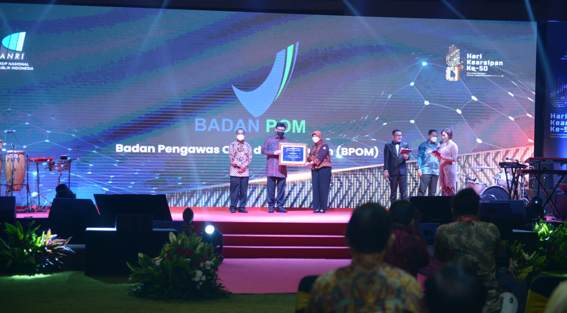 Jakarta – Berdasarkan Nilai Hasil Pengawasan Kearsipan Tahun 2020 yang dilakukan oleh Arsip Nasional Republik Indonesia (ANRI), Badan POM meraih Peringkat III Tingkat Lembaga Pemerintah Non-Kementerian dengan Kategori “Sangat Memuaskan”. Penghargaan atas hasil pengawasan tersebut diterima Badan POM pada Malam Puncak Peringatan Hari Kearsipan Ke-50 Tahun 2021 yang diselenggarakan di Gedung Arsip Nasional Republik Indonesia, Rabu (09/06).