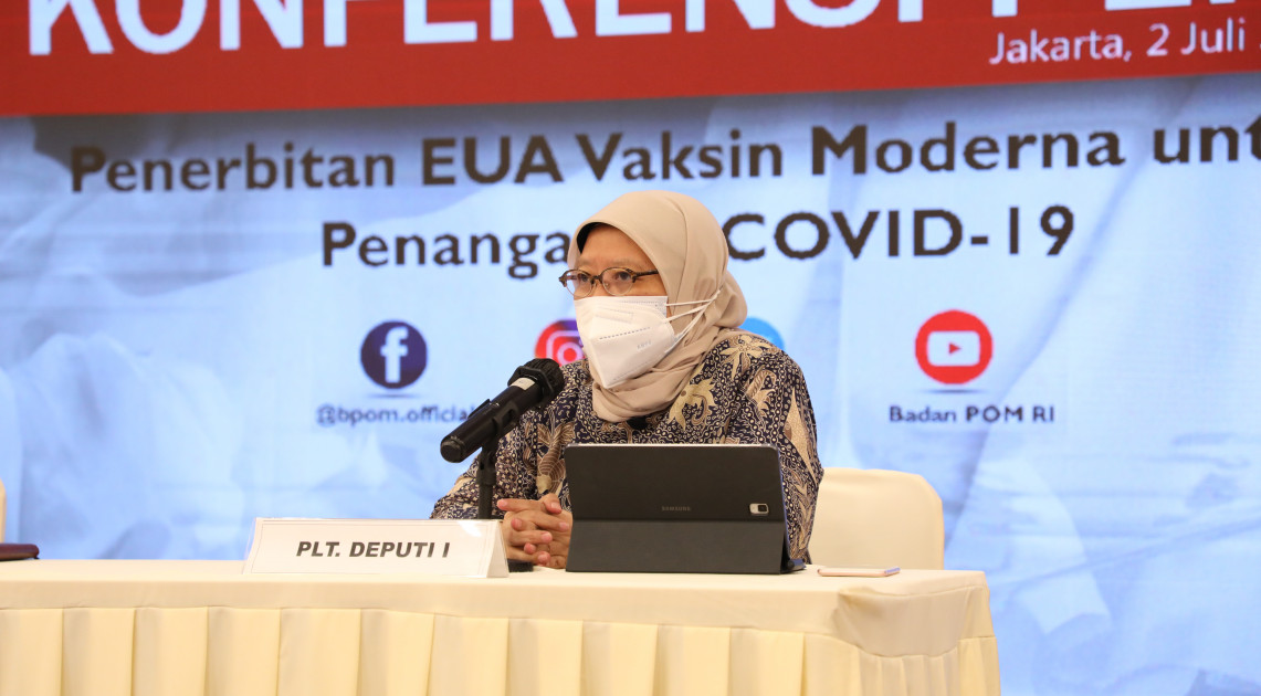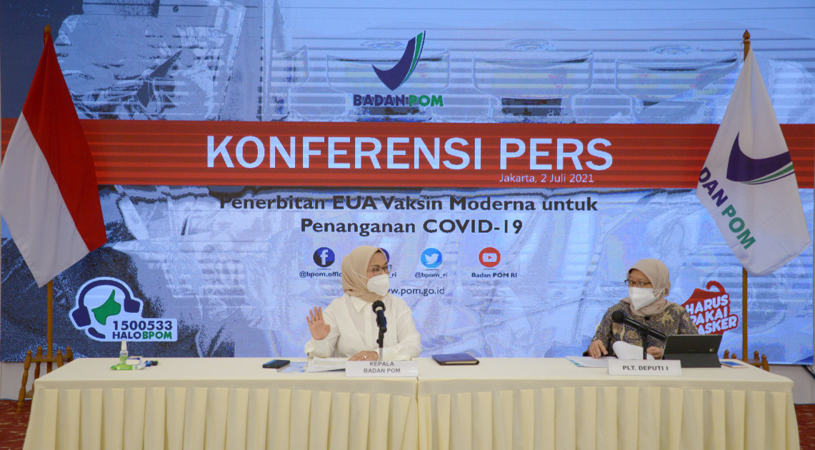 Jakarta – Badan POM resmi terbitkan Emergency Use Authorization (EUA) untuk Moderna COVID-19 Vaccine. Hal ini disampaikan langsung oleh Kepala Badan POM RI, Penny K. Lukito, dalam konferensi pers yang dilaksanakan secara daring pada Hari Jumat (02/07). “Moderna COVID-19 Vaccine merupakan vaksin pertama dari pengembangan menggunakan platform mRNA yang memperoleh EUA dari Badan POM,” jelas Kepala Badan POM RI, Penny K. Lukito.