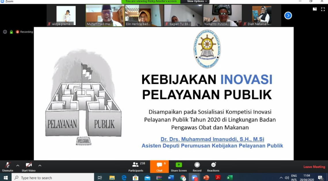 Walaupun pelaksanaan diskusi melalui video conference, antusias peserta Badan POM dalam mengikuti sosialisasi sangat besar terlihat. Sebagai penutup, Plt. Sekretaris Utama menyampaikan bahwa pengajuan inovasi kepada aplikasi Sinovik harus sebelum deadline yaitu 10 Mei 2020 dan diharapkan keikutsertaan tahun ini Badan POM dapat menjadi Top 99 dalam ajang KIPP 2020.