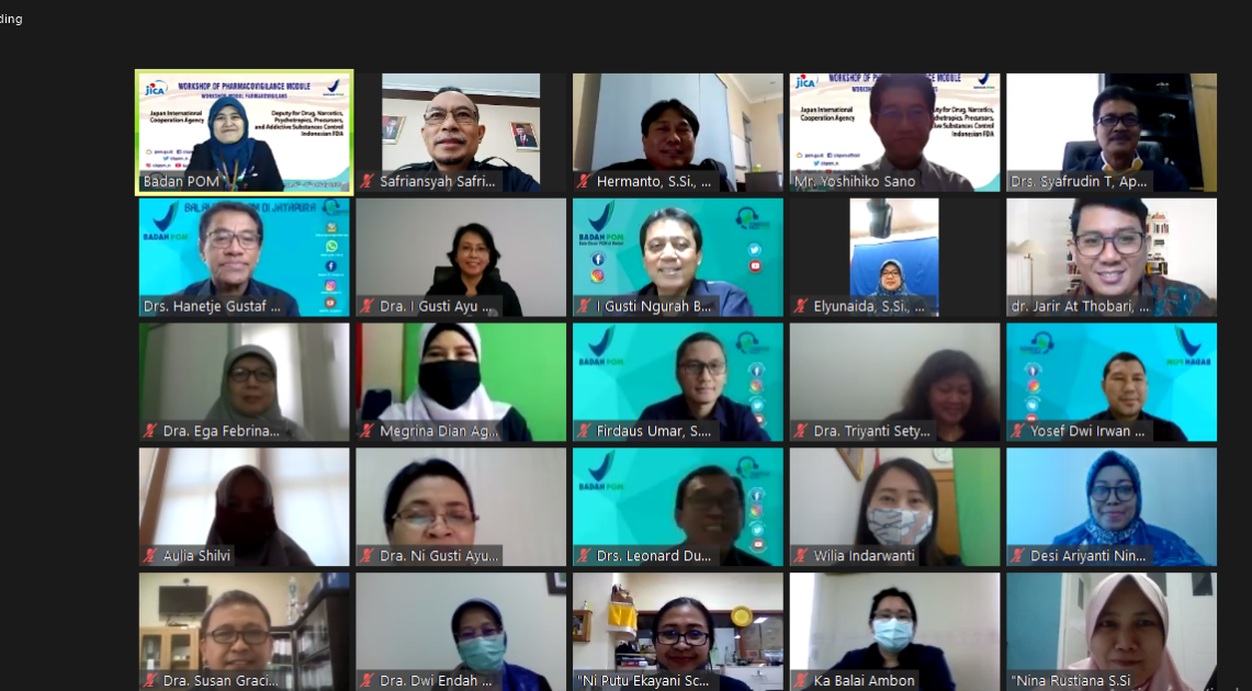 Jakarta – Badan POM menyelenggarakan kegiatan Workshop Modul Farmakovigilans melalui video conference yang diikuti lebih kurang 165 orang peserta dari Badan POM Pusat serta Balai Besar/Balai/Kantor Badan POM di kabupaten/kota. Kegiatan ini diselenggarakan sebagai aktivitas kerja sama Badan POM dengan Japan International Cooperation Agency (JICA) dalam Project for Ensuring Drug and Food Safety terkait perkuatan farmakovigilans di Indonesia.