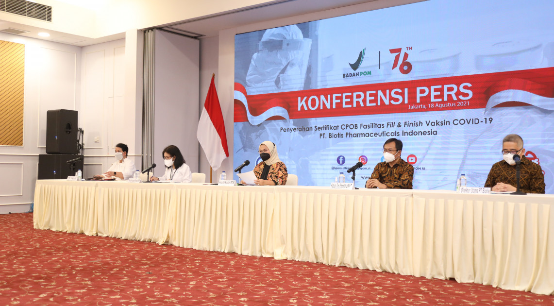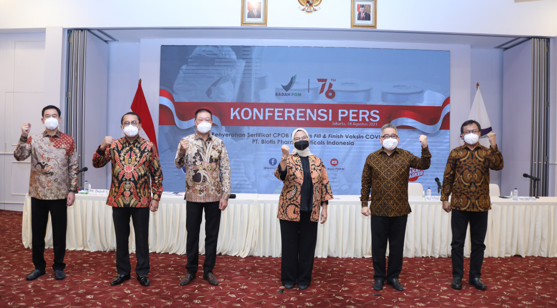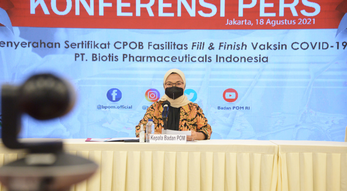 Jakarta – Badan POM menerbitkan Sertifikat Cara Pembuatan Obat yang Baik (CPOB) sarana produksi filling and finish Vaksin Merah Putih untuk PT Biotis Pharmaceuticals Indonesia. Sertifikat diberikan secara langsung oleh Kepala Badan POM RI, Penny K. Lukito kepada Direktur Utama PT Biotis FX Sudirman, Rabu (18/08). Penerbitan CPOB ini merupakan langkah konkret Badan POM dalam mengawal produksi vaksin buatan anak bangsa yang valid, saintifik, dan terpercaya.